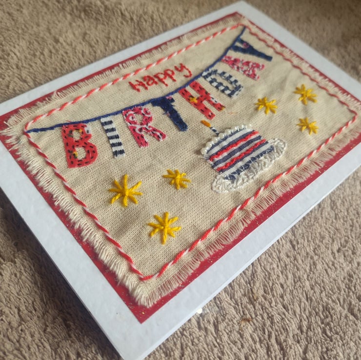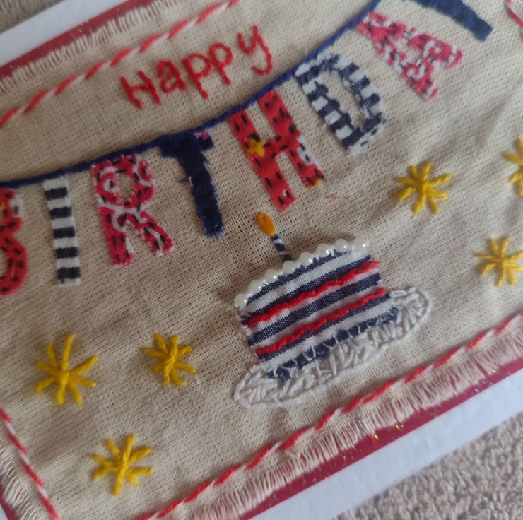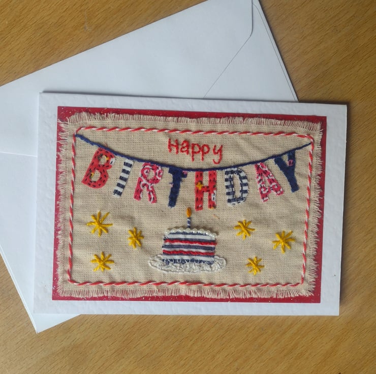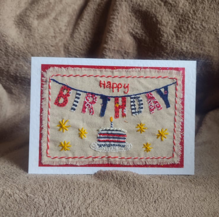 Hand-stitched applique "BIRTHDAY" text bunting design card, with embroidered details on a natural raw edged calico fabric, layered onto red glitter paper and a white hammer textured A6 (105 x 148mm) folded card.