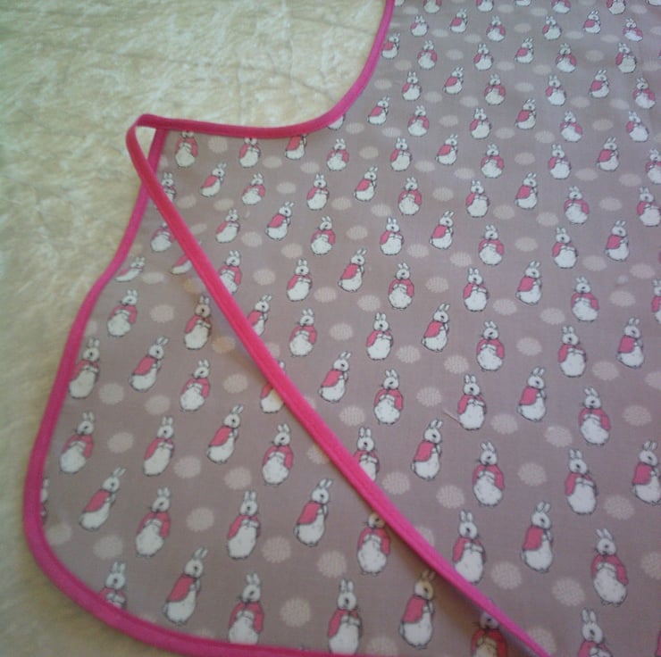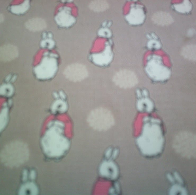 The fabric used is dark beige and has white rabbits in dark pink capes and is edged with dark pink bias binding.