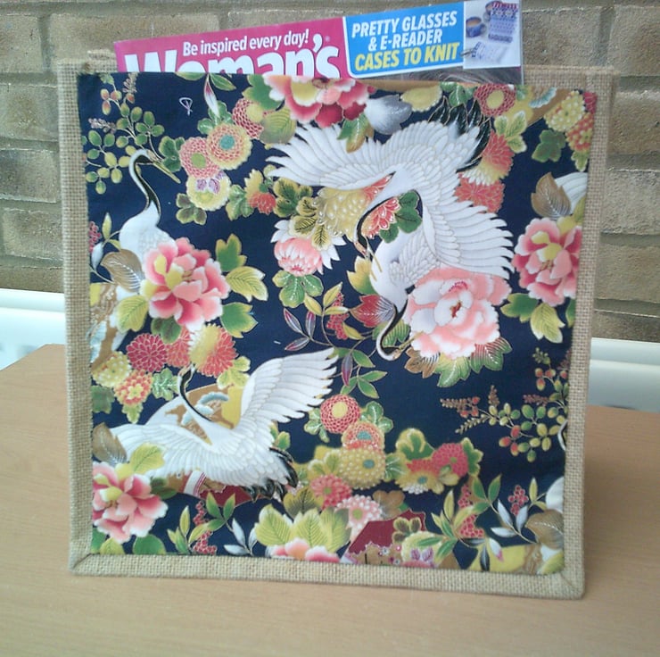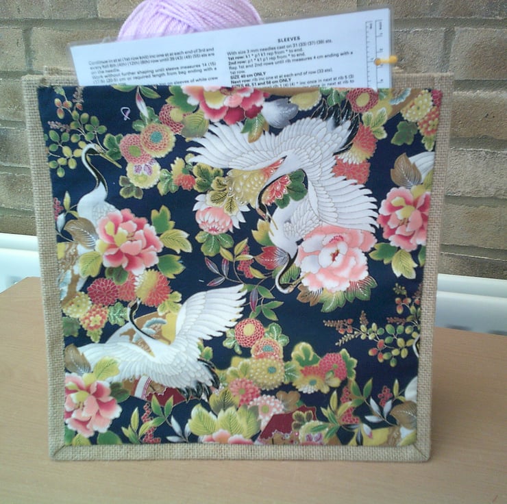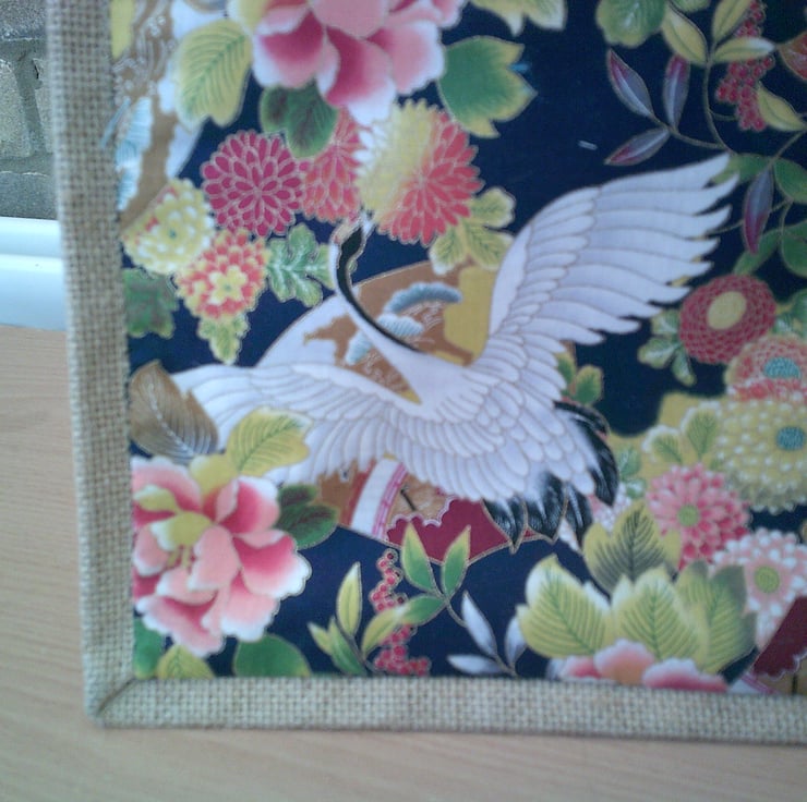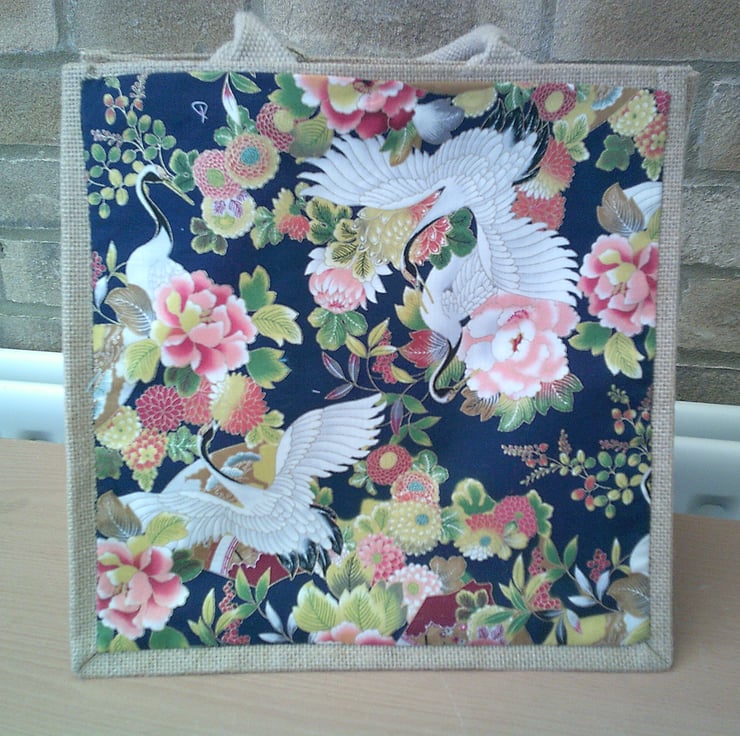 The bag itself measures approximately 30 x 30 x 20 cm (12 x 12 x 8 inches). The fabric pocket - which has been hand sewn onto the bag is a panel featuring Japanese Cranes and flowers on a Navy Blue background.