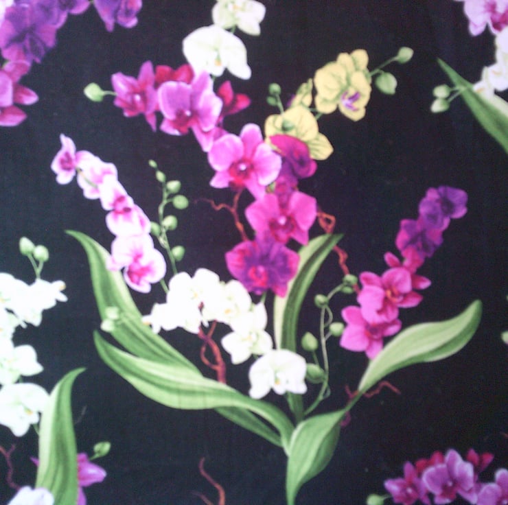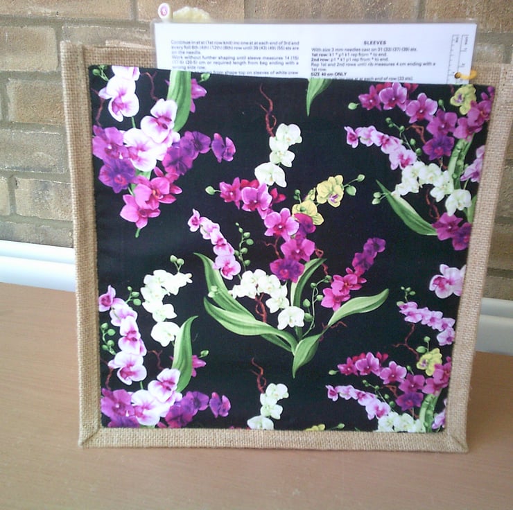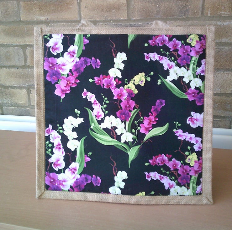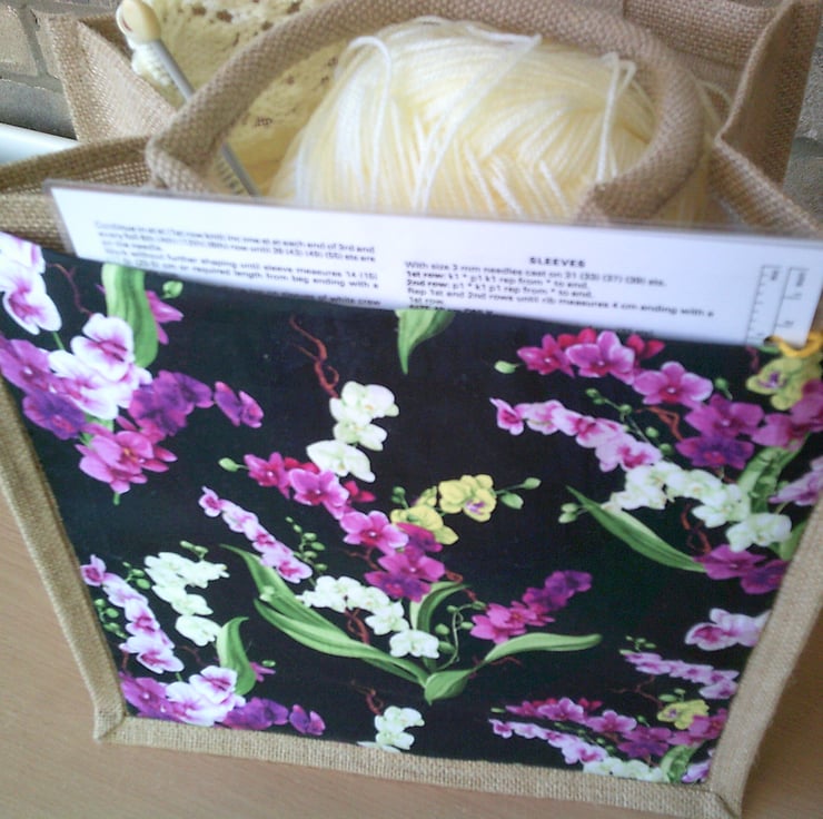 The bag itself measures approximately 30 x 30 x 20 cm (12 x 12 x 8 inches). The fabric pocket - which has been hand sewn onto the bag is a striking design of pink, white and yellow orchids on a black background.