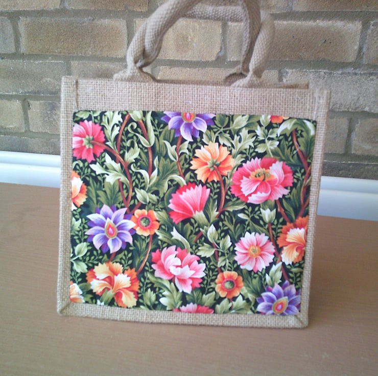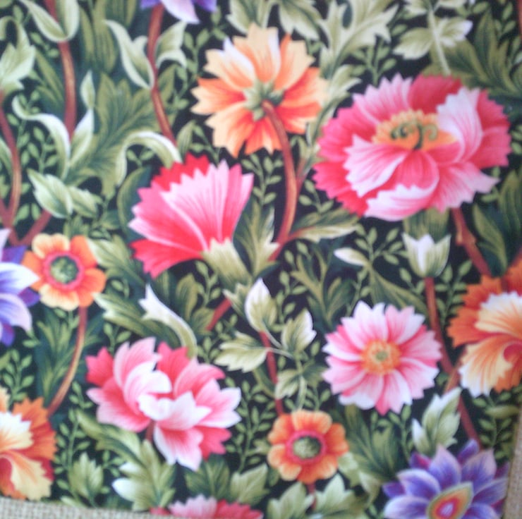 The bag itself measures approximately 22 x 20 x 13 cm (9 x 8 x 5 inches). The fabric pocket - which has been hand sewn onto the bag has a design of Brightly coloured Flowers and leaves on a black background.