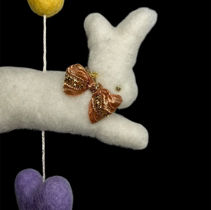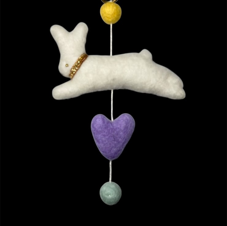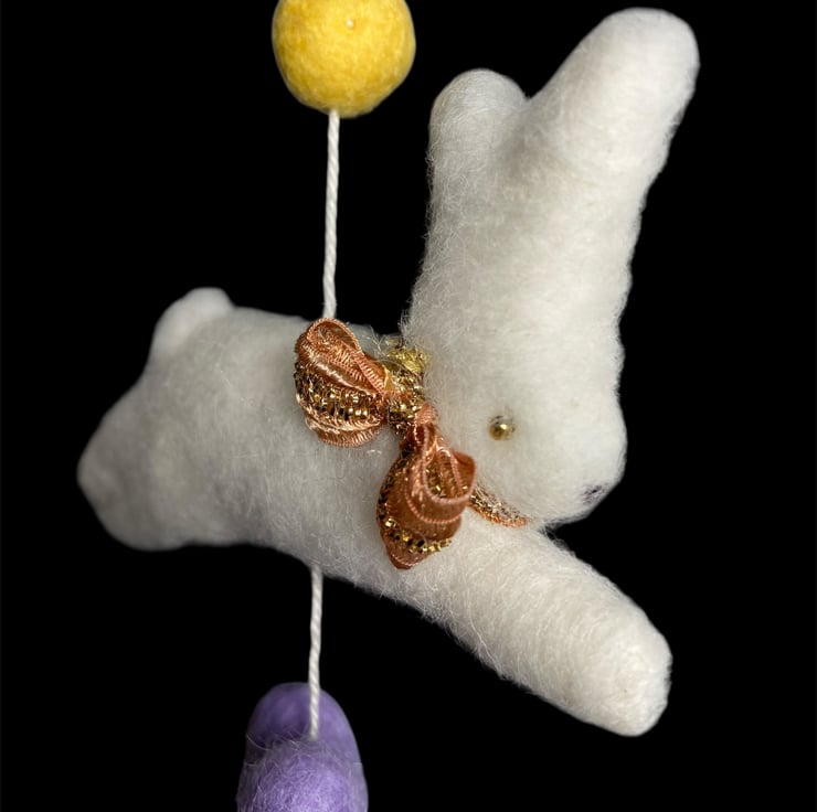Suitable for hanging on a wall or suspending from the ceiling, this sweet hanging decoration features a fluffy white leaping bunny with multicoloured felt balls and a heart. The felted white bunny measures approximately 10cm wide and is lightly stuffed to create a 3d effect. The bunny has a sparkly golden bow around his neck and gold coloured beaded eyes. A brass ring has been added to the top of the decoration to facilitate hanging. The decoration can be hung on the wall or suspended allowing it to turn in the breeze. if hung over a cot, please hang out of reach of young baby.