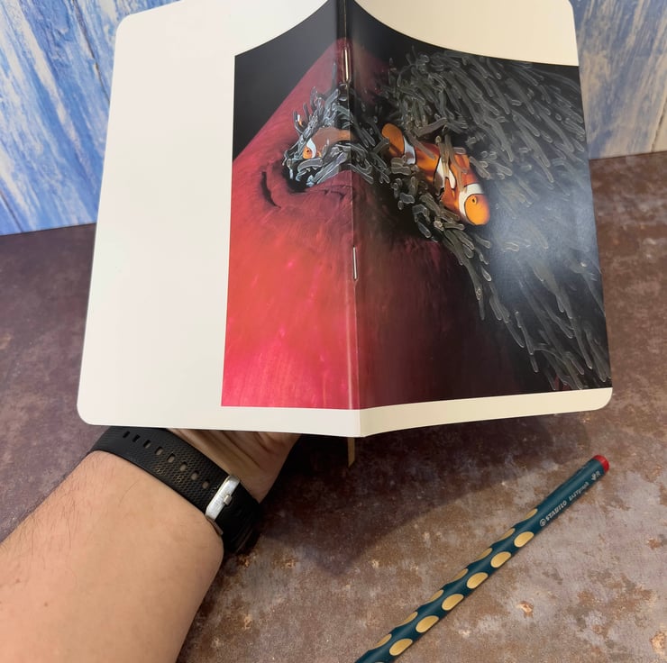 I’m not thinking I can save the world but I do think we should avoid waste when we can and these pictures seemed too wonderful to not to be put to a better use. I added pages of 100% recycled paper (approx 80gsm), stapled it all together with a page marker made from left over ribbon and trimmed it all up to make a series of marine themed notebooks.