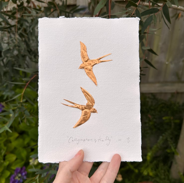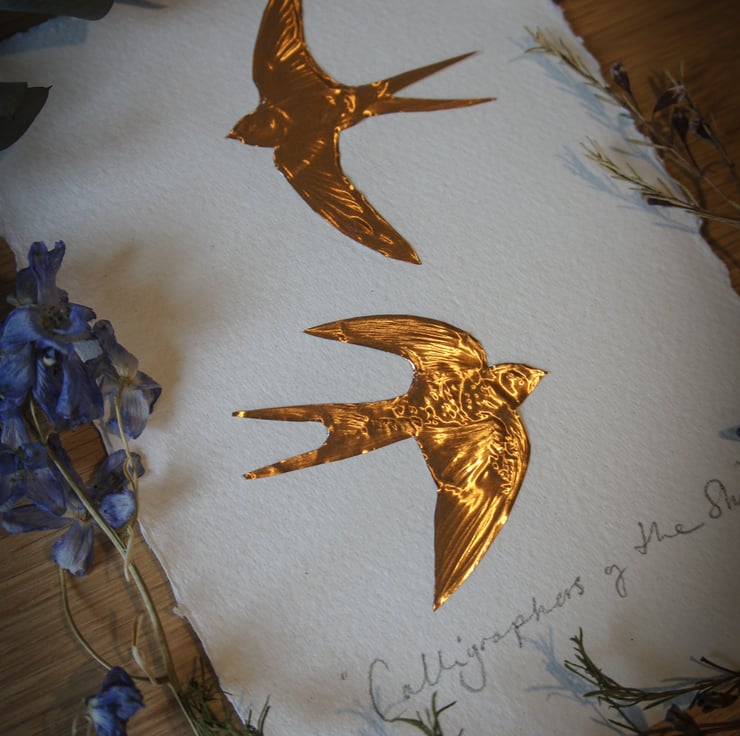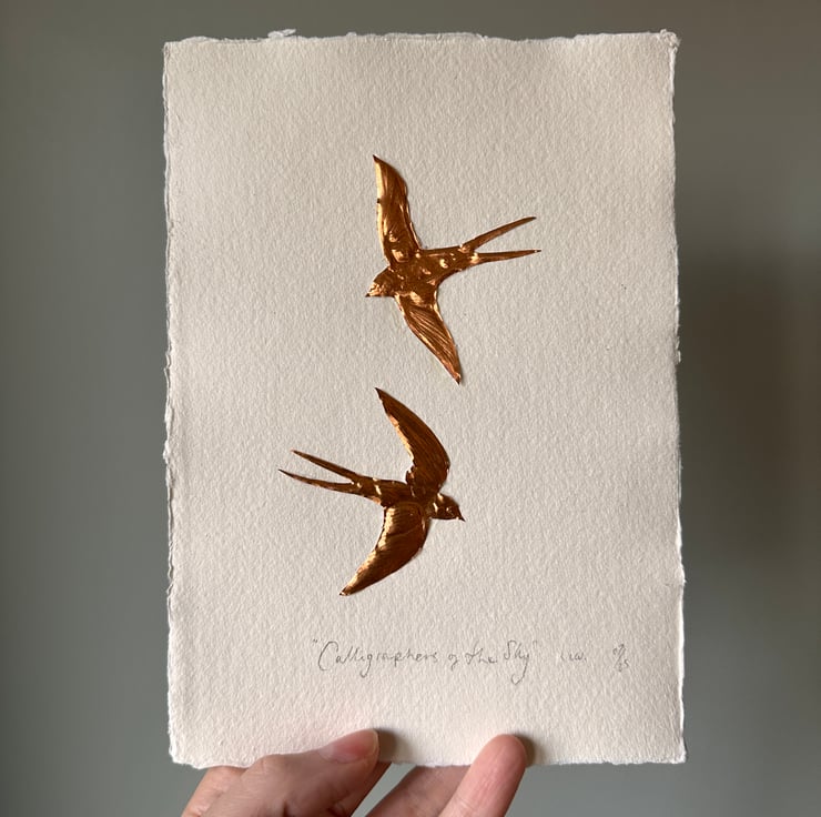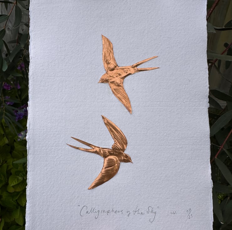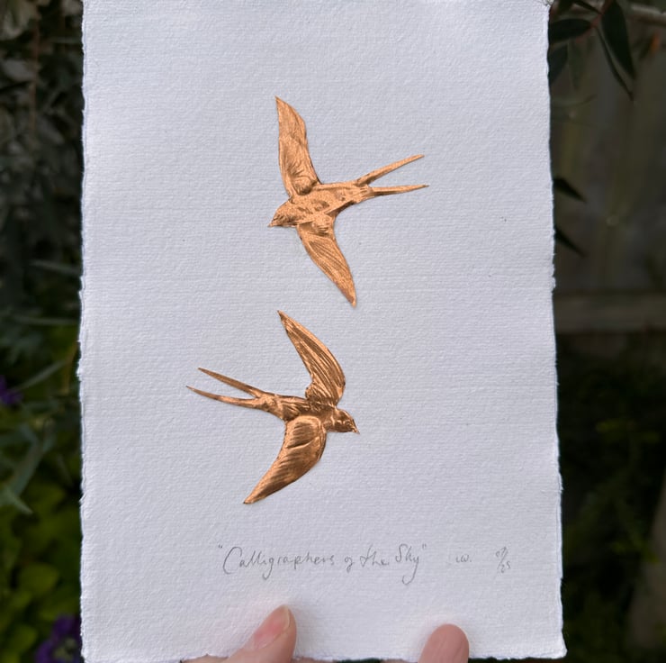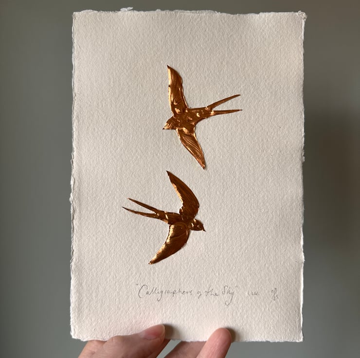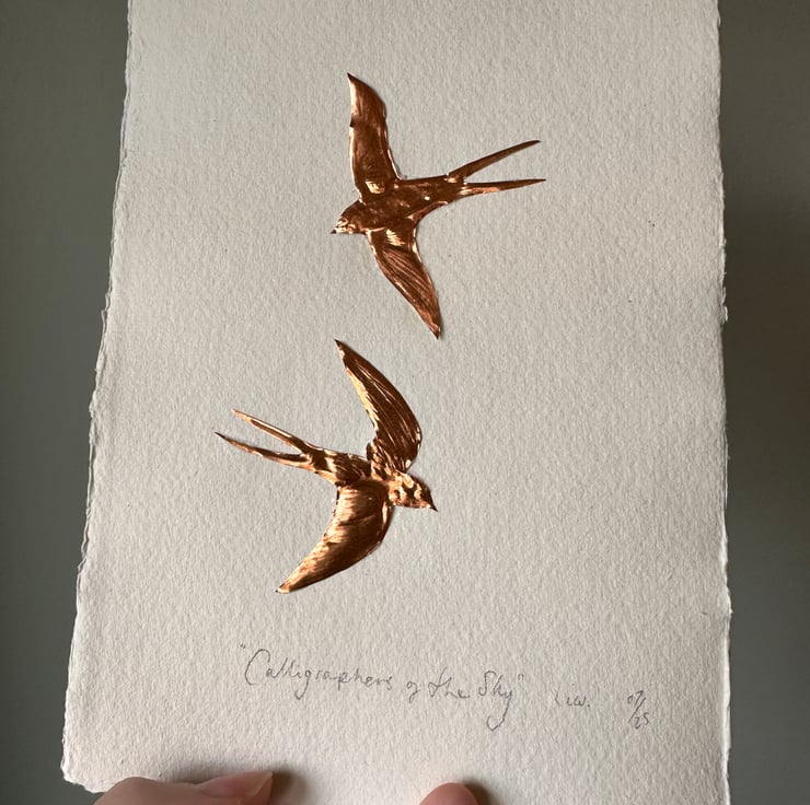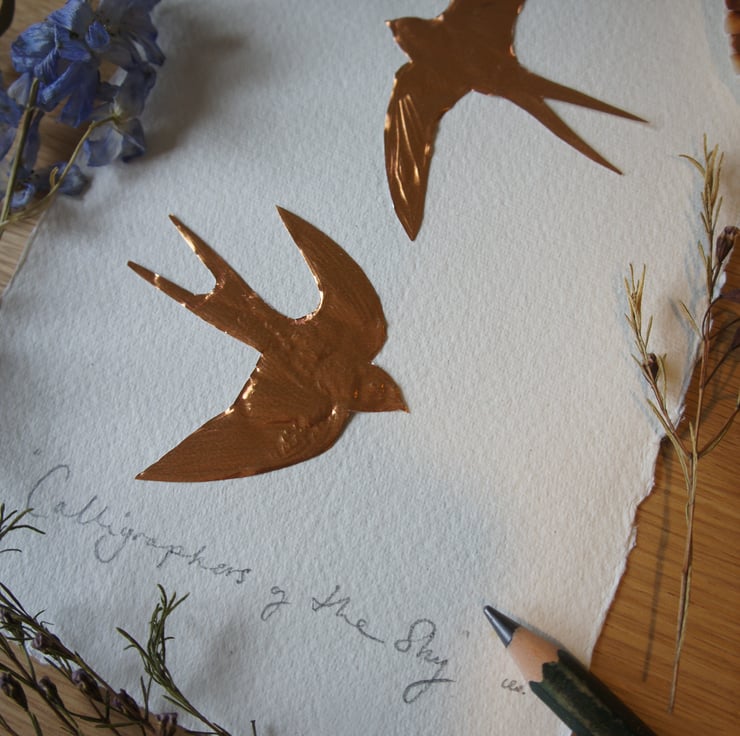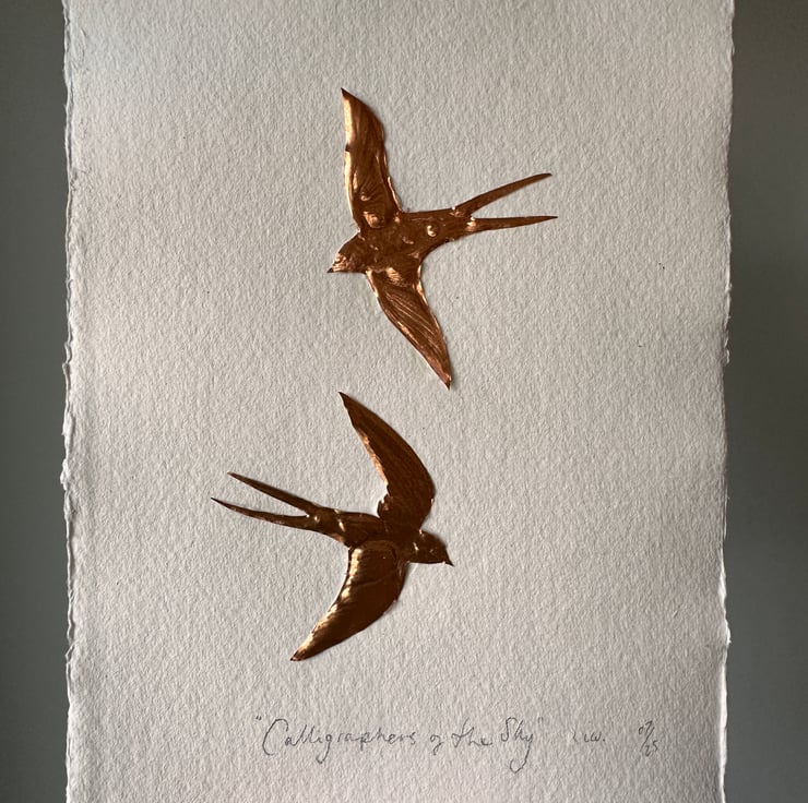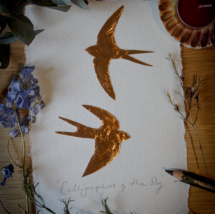 Two small hand cut and embossed copper foil swallows with the words underneath,