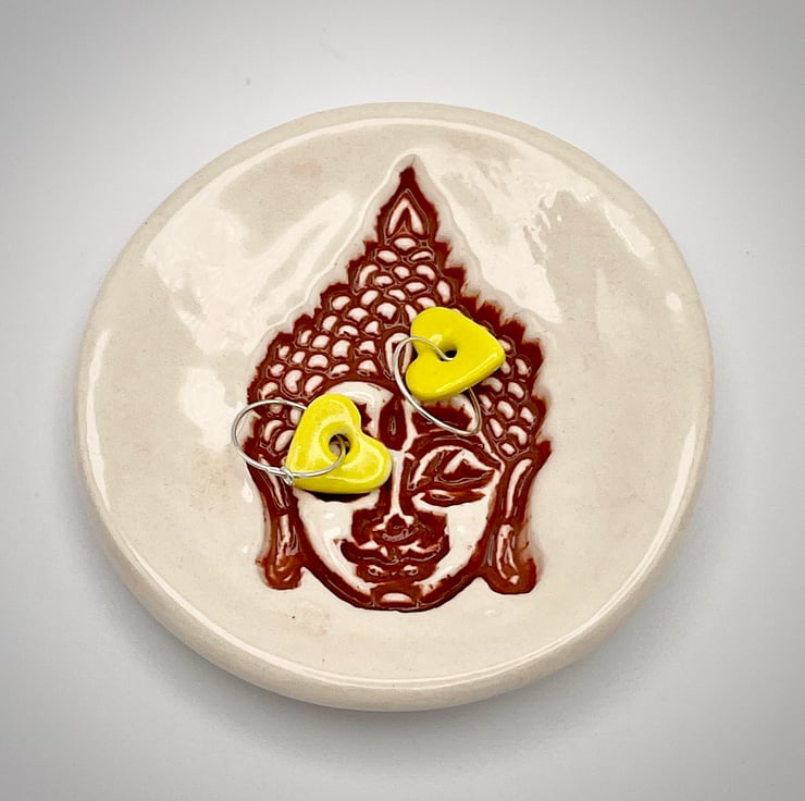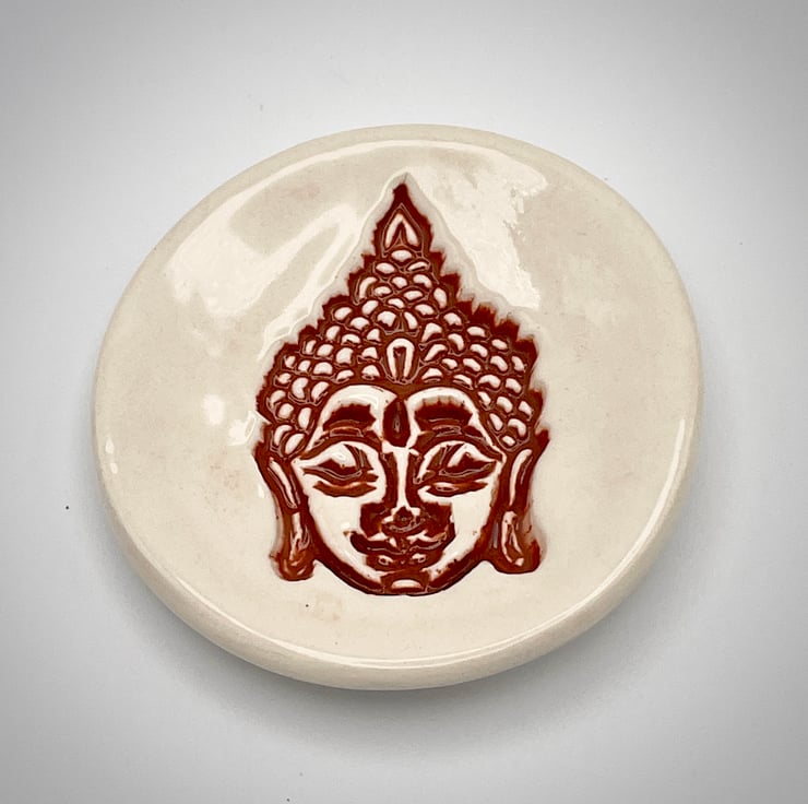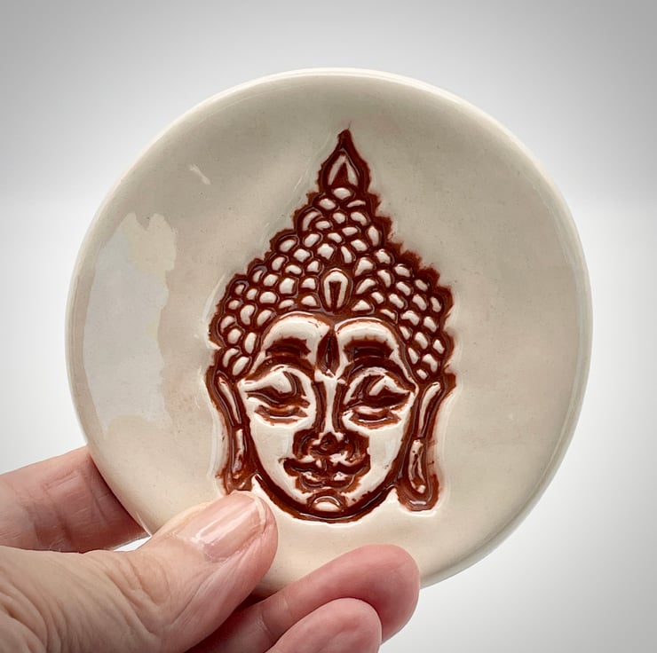 This is my ceramic ring dish embossed with a Buddha design, it can also be used for your trinkets and little treasures, or as a small soap dish