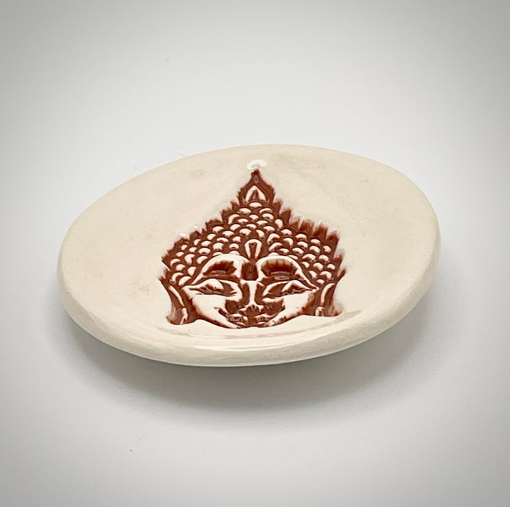 This handcrafted ceramic dish has been created using the slab-work method and embossed with a Buddha design before shaping into a mould. Once dried it has been bisque fired to 1000C, after a gentle sanding it has been hand-painted with a brown underglaze before a clear glaze is added. After glazing it has had a second firing in the kiln to 1160C.