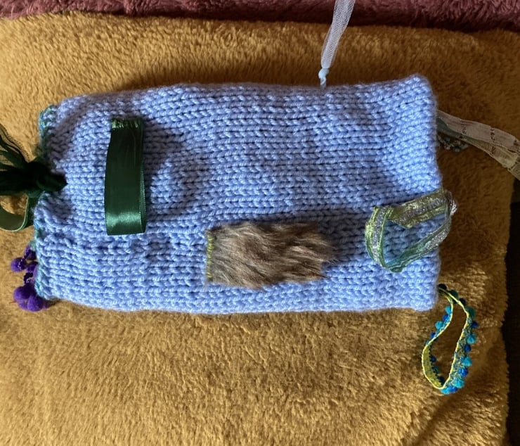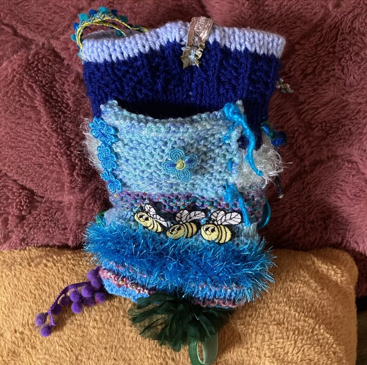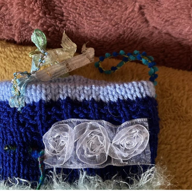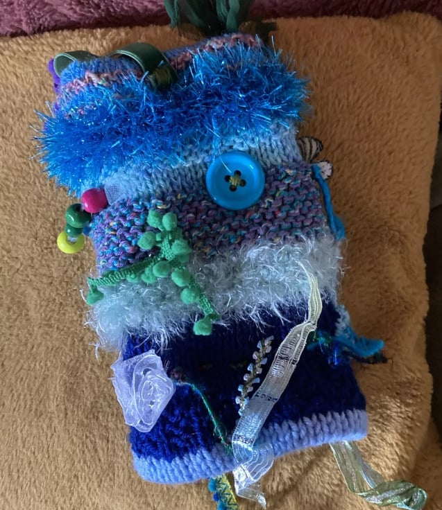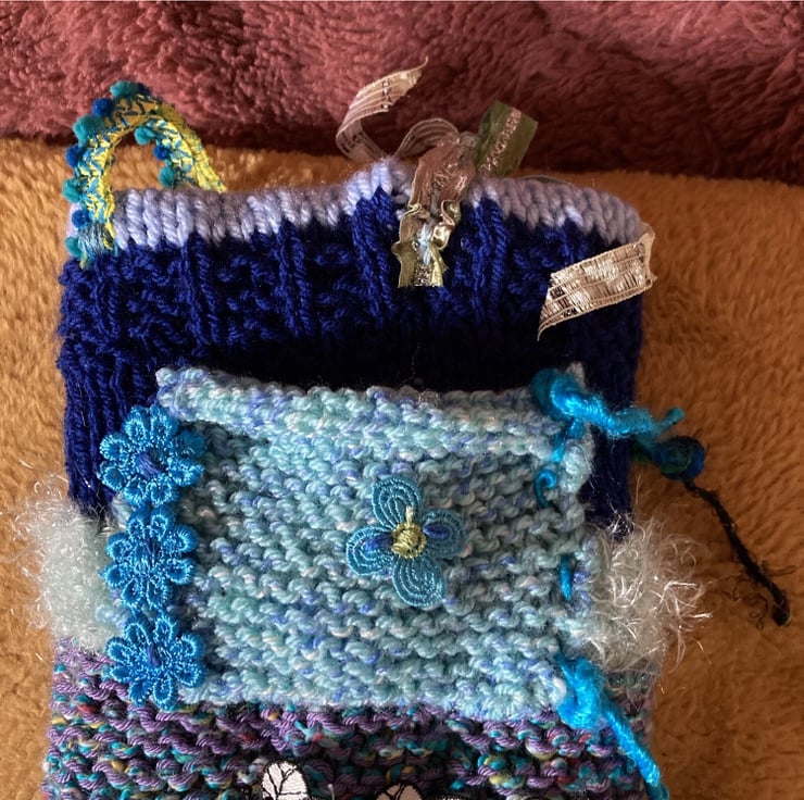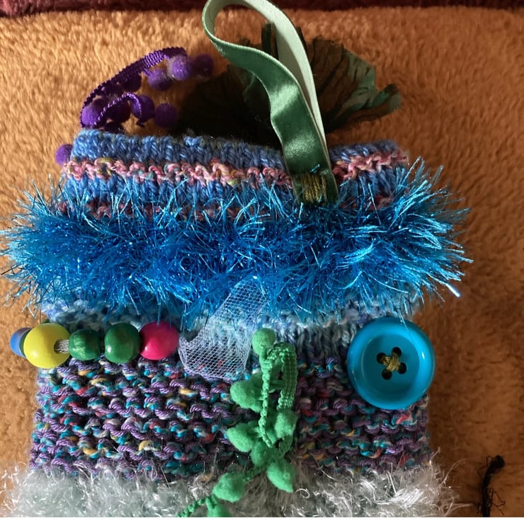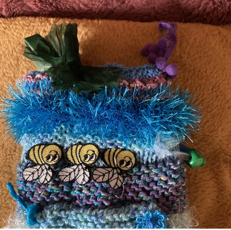 This hand knitted muff is made up of a variety of yarns and wool and adorned with many different attachments.