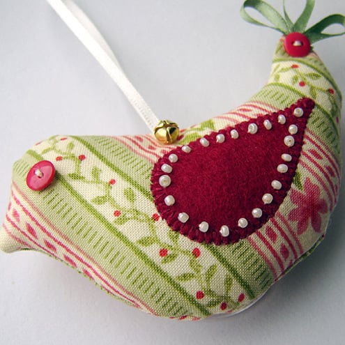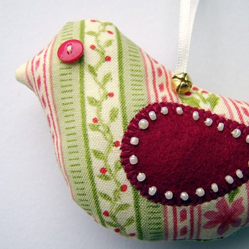 The bird is made from a lovely festive print fabric, complete with an appliqued wing with bead detail and ribbon tail. It has an ivory ribbon hanging loop which is attached to the bird with a little gold bell. It is filled with polyester wadding.