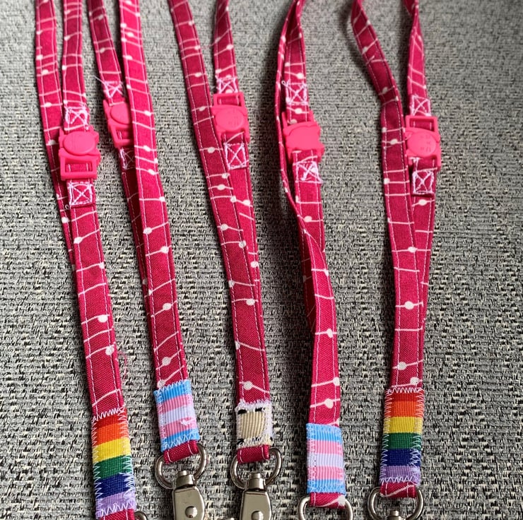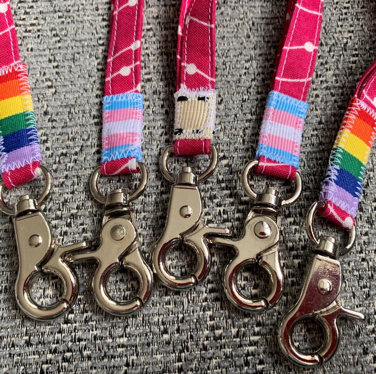 Hand made by me from 100% cotton fabric, with lobster clip ends. Finished with a choice of LGBTQIrainbow, Transgender Pride, or white ribbon