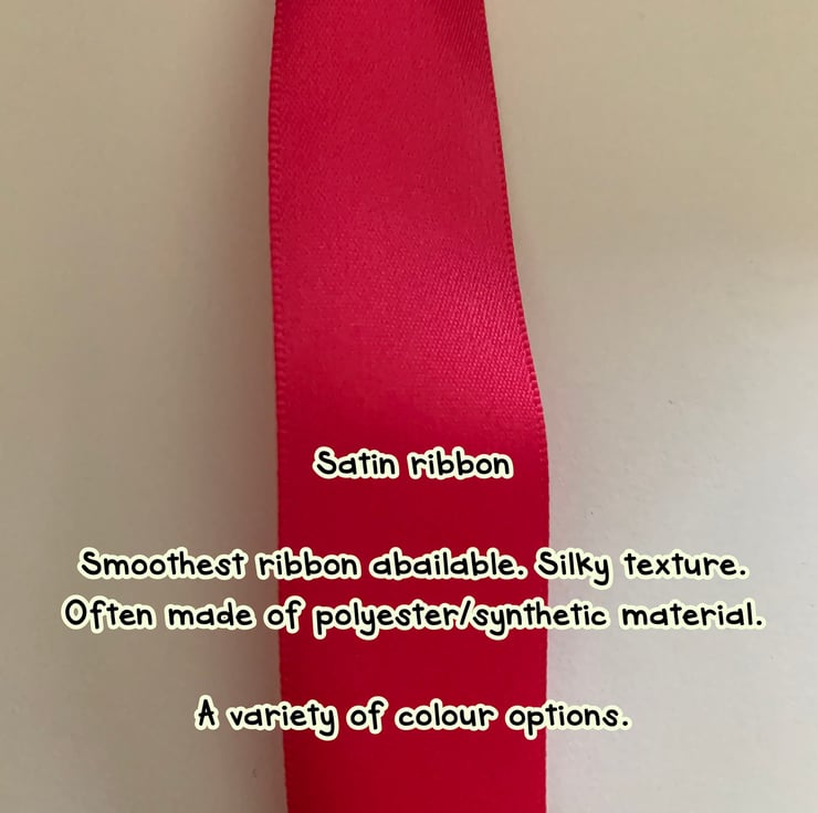 Options for ribbons are shown with primary texture first, wrapping texture second. E.g. "Satin/Grosgrain" is a Satin ribbon wrapped with a Grosgrain ribbon.