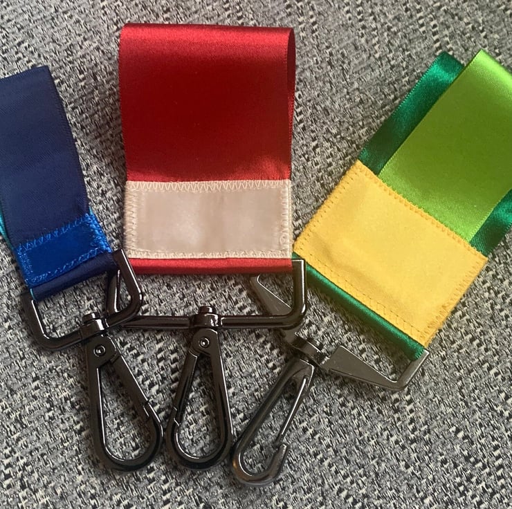 Two tabs of ribbon with a lobster clip at the end. The cost of this item reflects the much increased time necessary to complete this item.