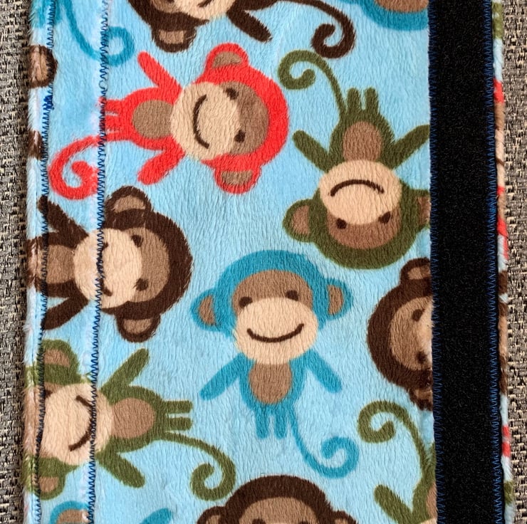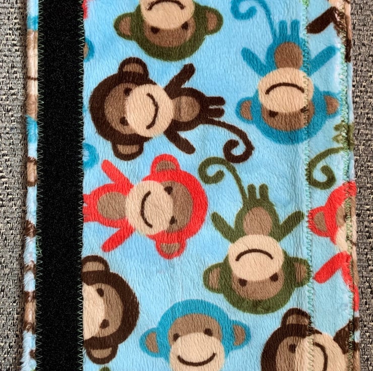 This is a fully reversible seat belt cover with 100% cotton fabric on one side and plush fabric on the other. It fastens around a standard sized seatbelt with velcro so it's easy and fast to transfer between cars or seats.