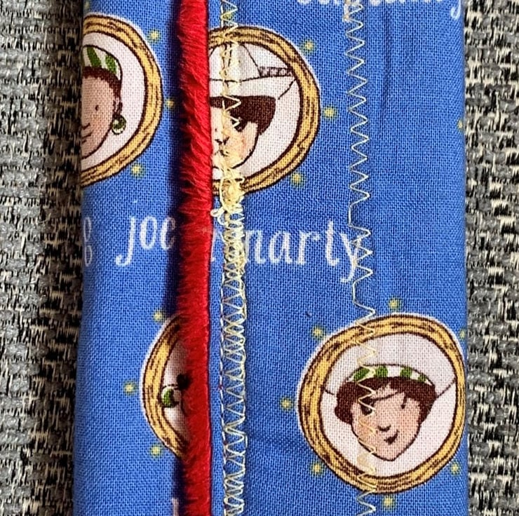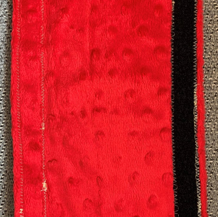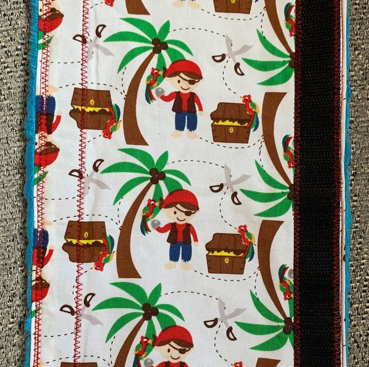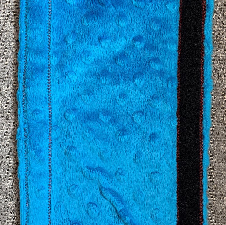 This is a fully reversible seat belt cover with 100% cotton fabric on one side and plush fabric on the other. It fastens around a standard sized seatbelt with velcro so it's easy and fast to transfer between cars or seats.