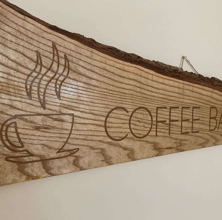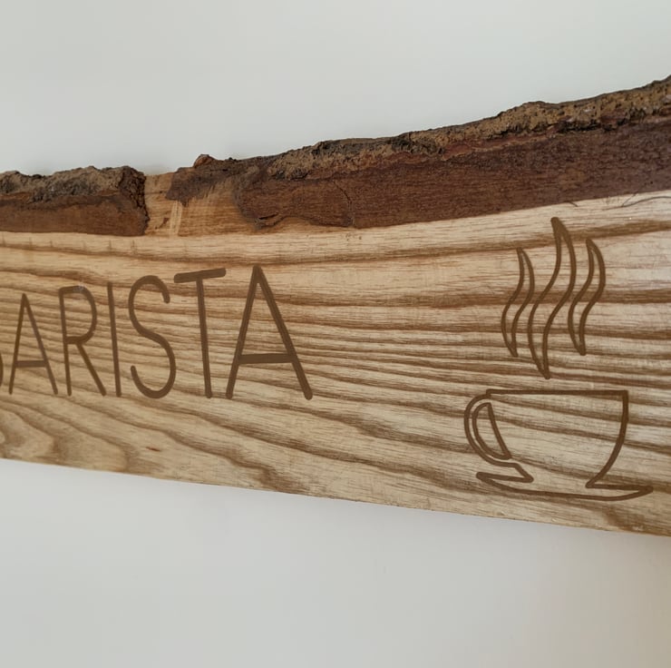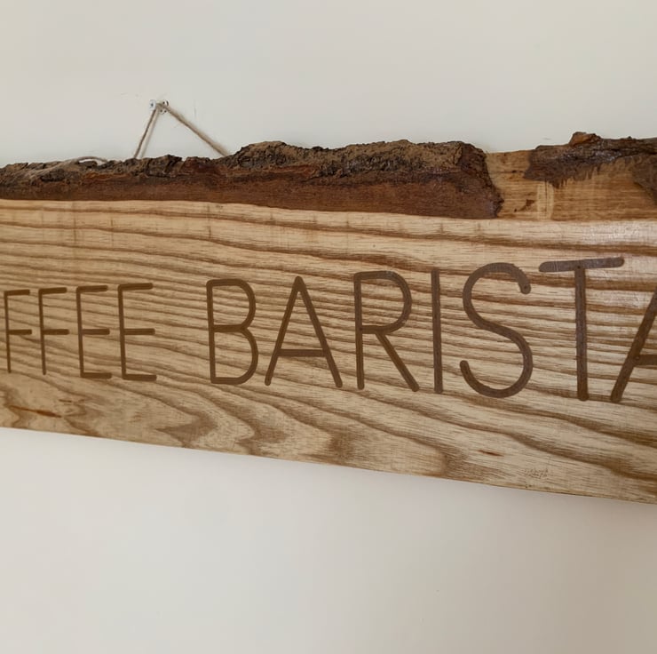 Made from solid wood - carved with the words Coffee Barista and images of cups of hot coffee.