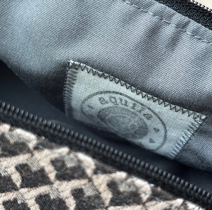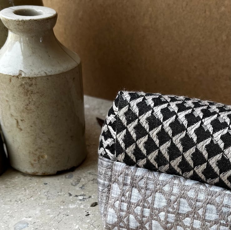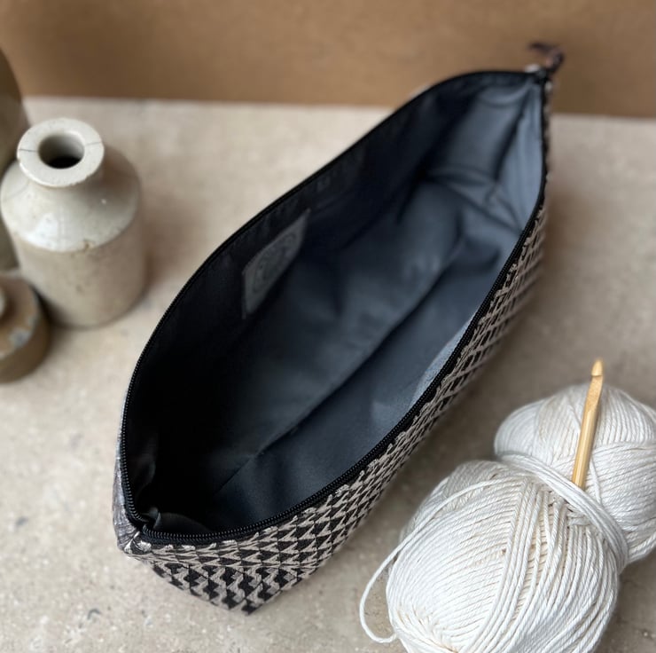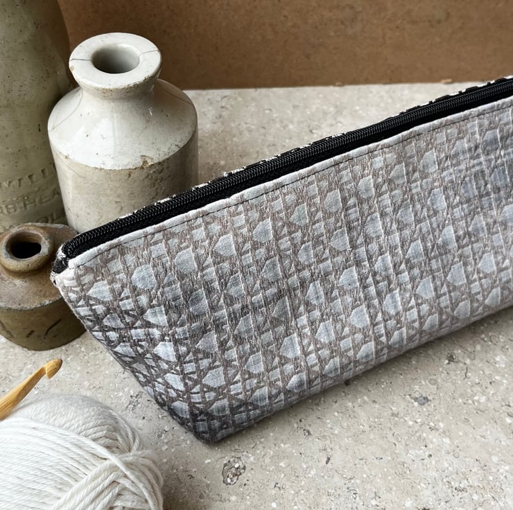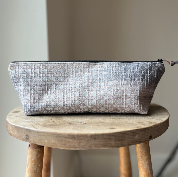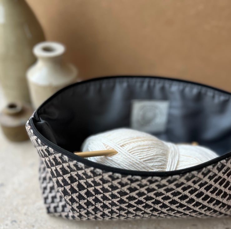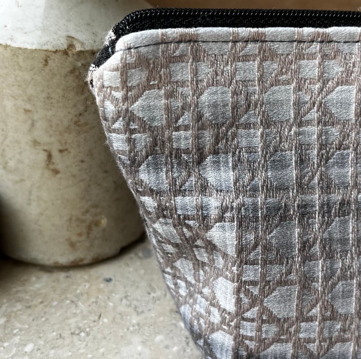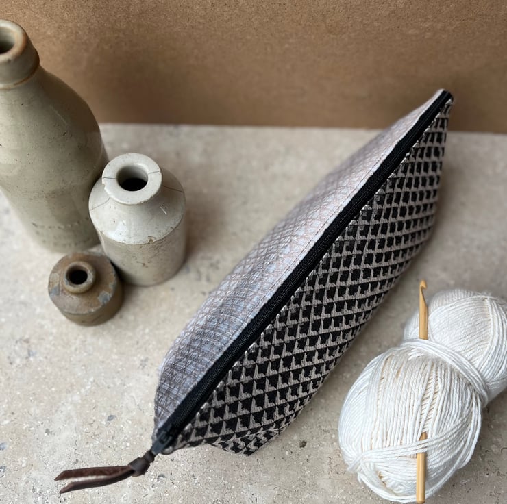 Practical large zip pouch made from coordinating sample swatches of upholstery fabric with a geometric pattern. The pouch is fully lined with grey fabric with a slightly metallic sheen.