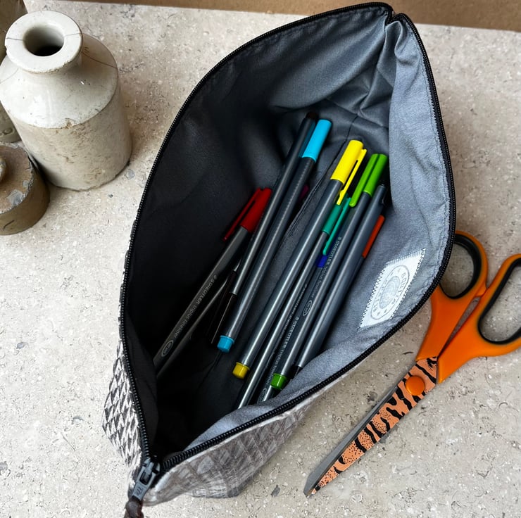This pouch sits on a wide base and is very practical for pens and pencils, small craft projects and tools.