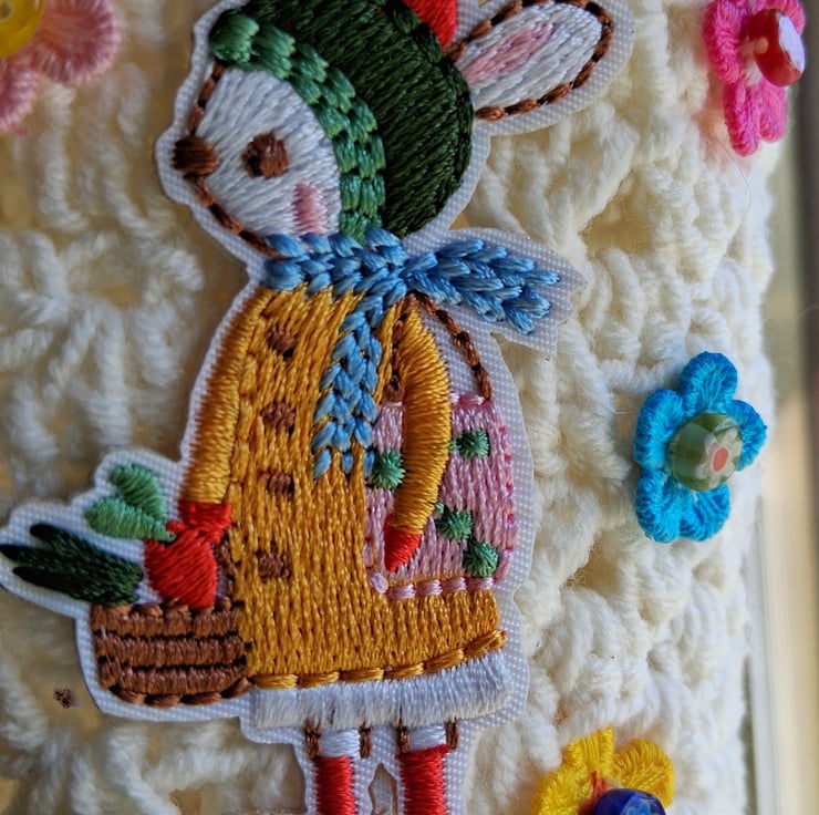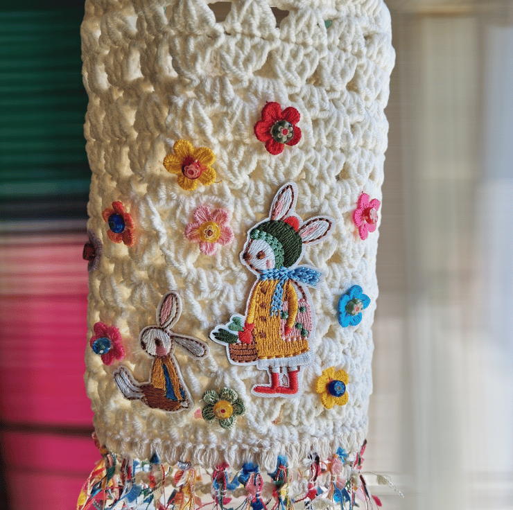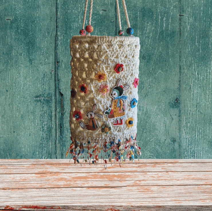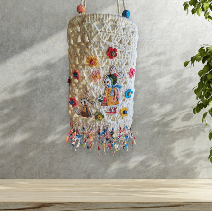 This is a cute crocheted rabbit lantern mobile which is perfect for a nursery window or hung above a crib. Decorated with sweet rabbits and beaded flowers. Diameter 10 cm, length (including fringe) 20 cm. The ties are 19 cm long.