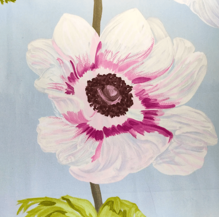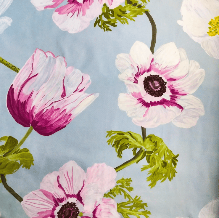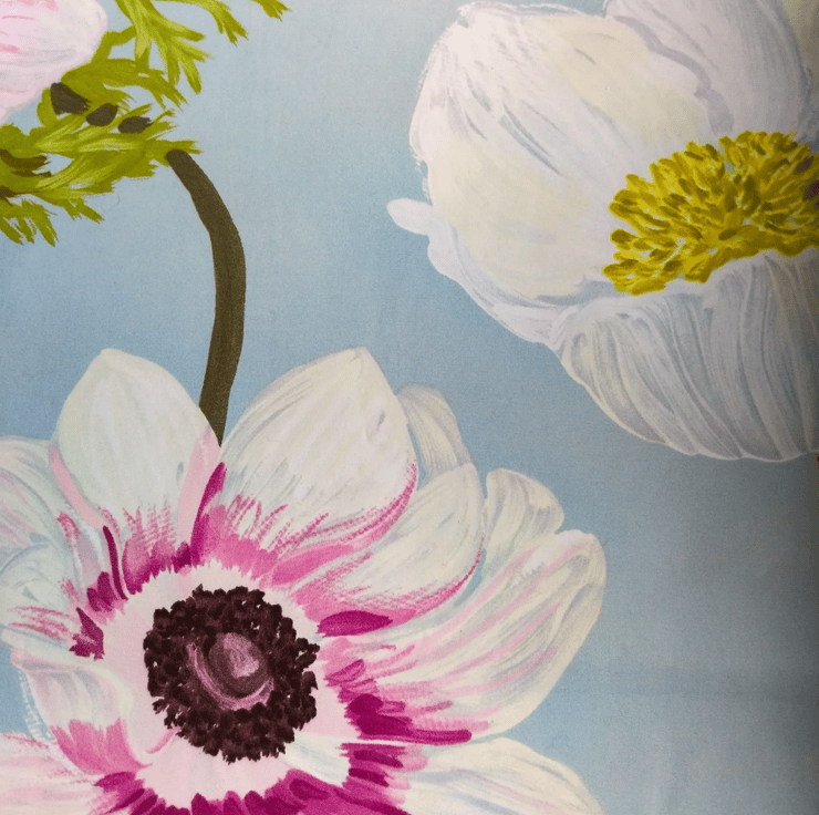 A fabulous and vibrant display of anemones and tulips in radiant pinks, all set against a bold blue background.