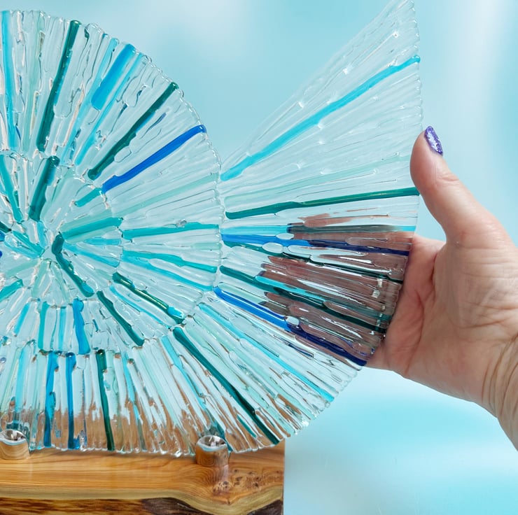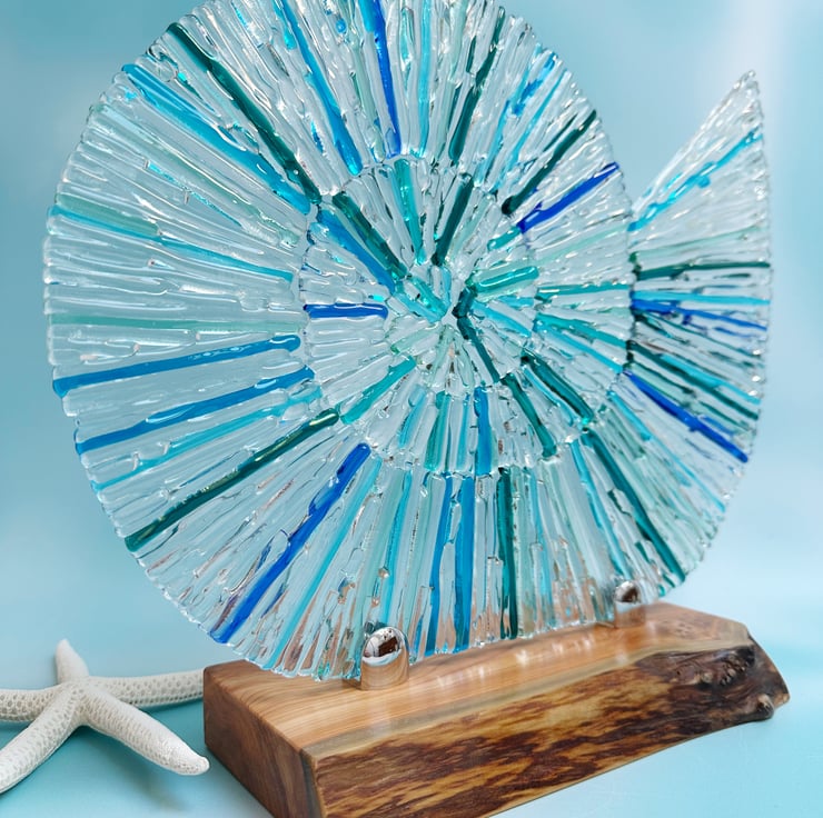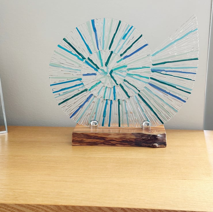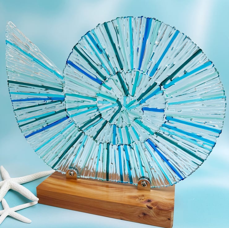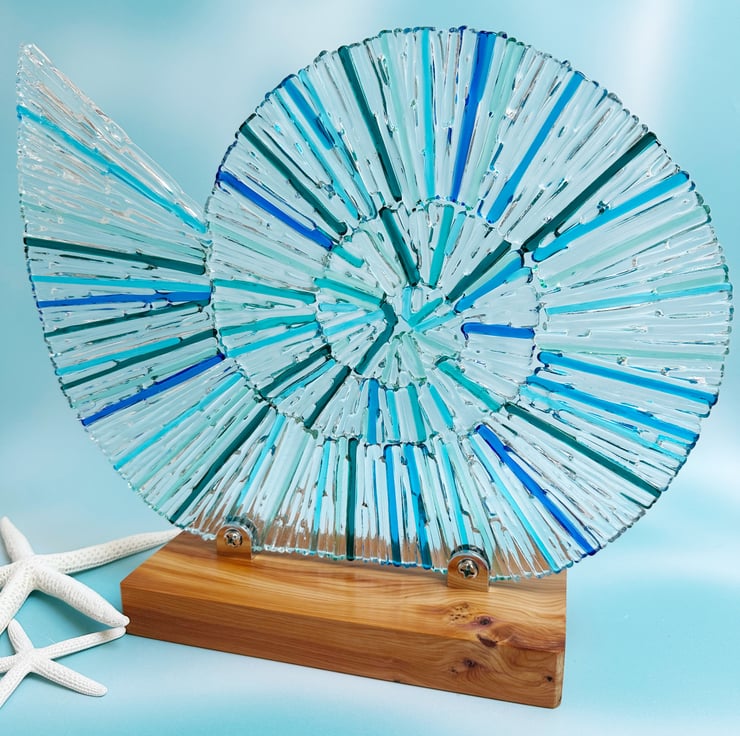 Fused Glass Ammonite - Shades of Blue & Clear - A Sculptural Statement Piece