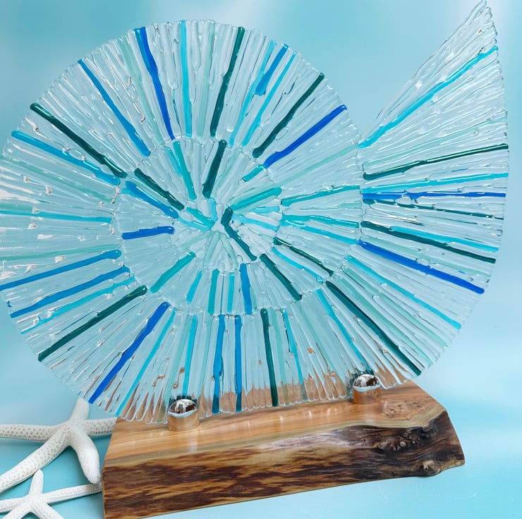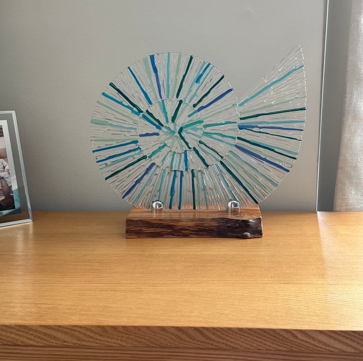 A large statement piece of fused glass art in the shape of an ammonite shell.