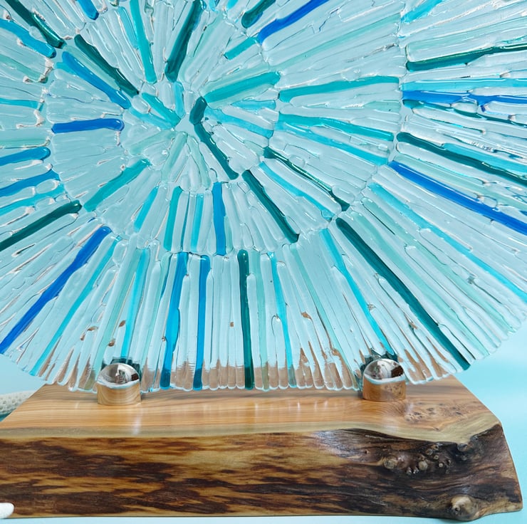 Using artistic licence and the colours of the sea to create this large unique statement piece of fused glass which sits on a bespoke stand made from yew tree wood.