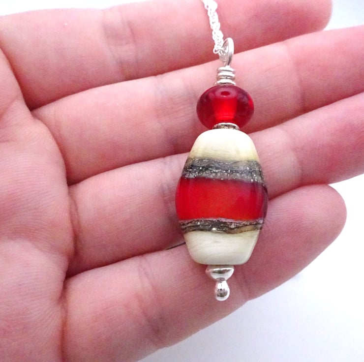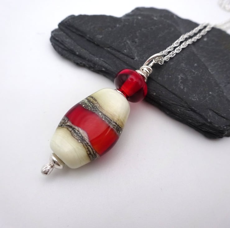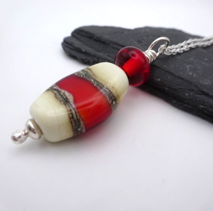 A sterling silver chain which features a handmade lampwork glass pendant made with ivory and red glass.