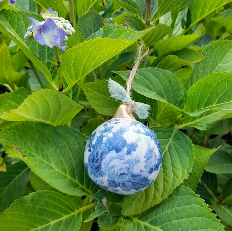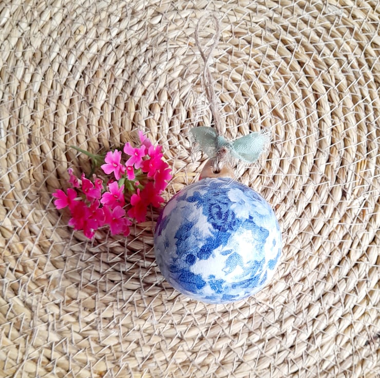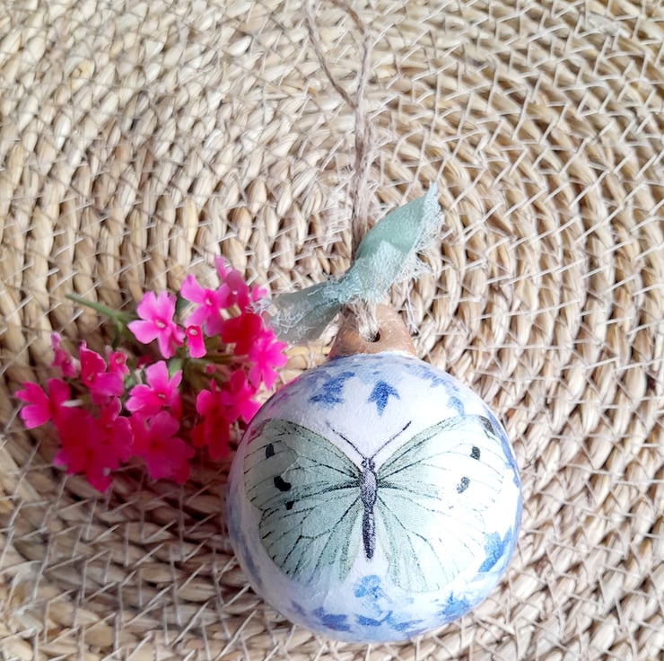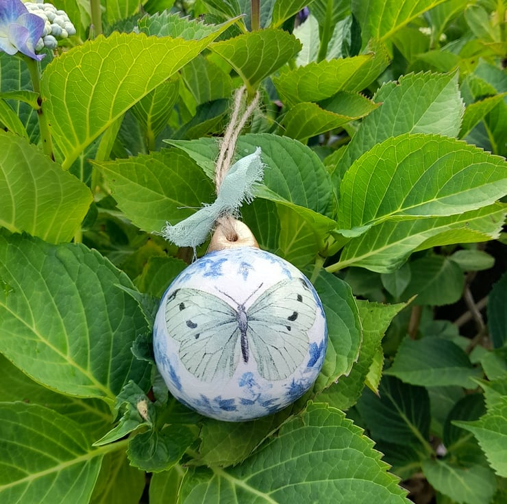 This round ceramic bauble has been decoupaged with the prettiest butterfly & lovely blue florals surrounding it.