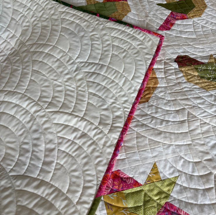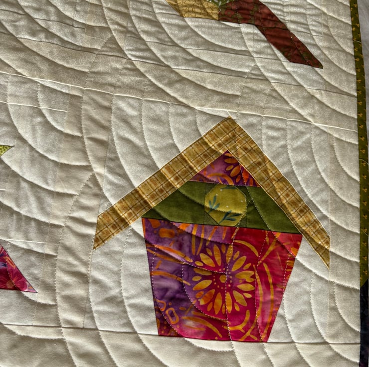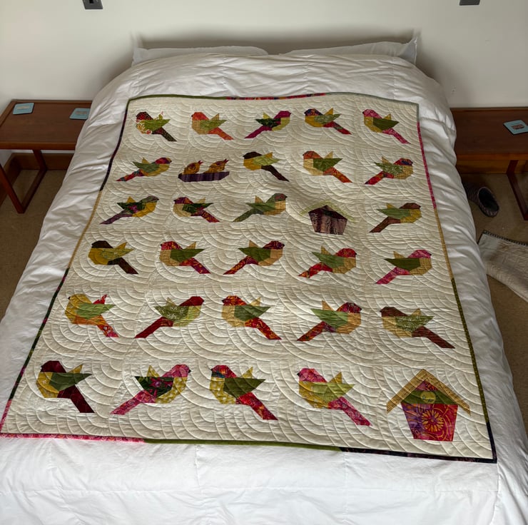 This is a group project called 'Birds of a Feather'. It features birds and birdhouses in stunning batik fabrics on a crisp looking antique white background. It is machine quilted with a very traditional 'Baptist Fan' design and is filled with a polyester wadding which can be gently washed and air dried. The quilt measures 49" by 59" and sits nicely on top of a double/kingsize bed or could be displayed as a wall hanging. The scrappy binding sets it off perfectly.