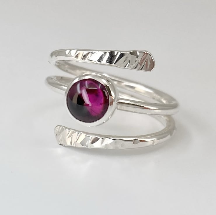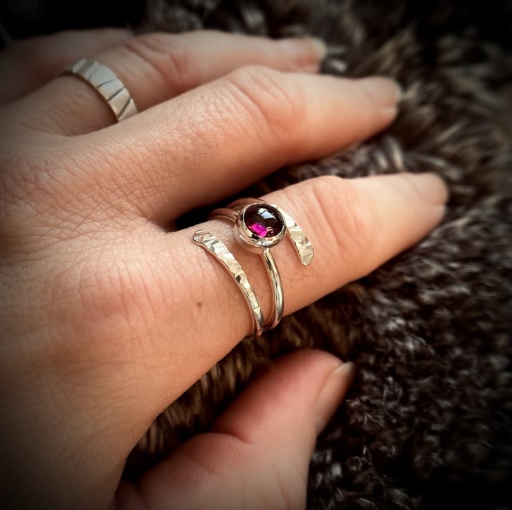 This handmade sterling silver wrap around ring features a lovely contrast of smooth and textured finishes, brought together with a beautiful 7mm, bezel set rhodolite garnet gemstone at the front. The contemporary yet minimalist design makes it effortlessly versatile: easy to pair with any outfit while still standing out as a unique statement piece.