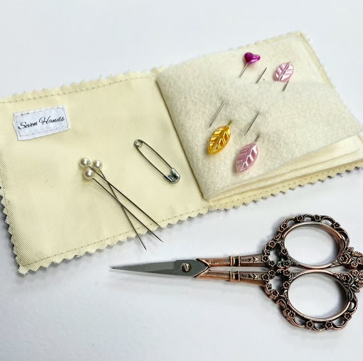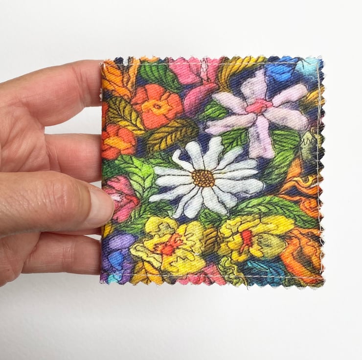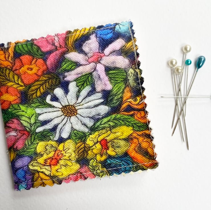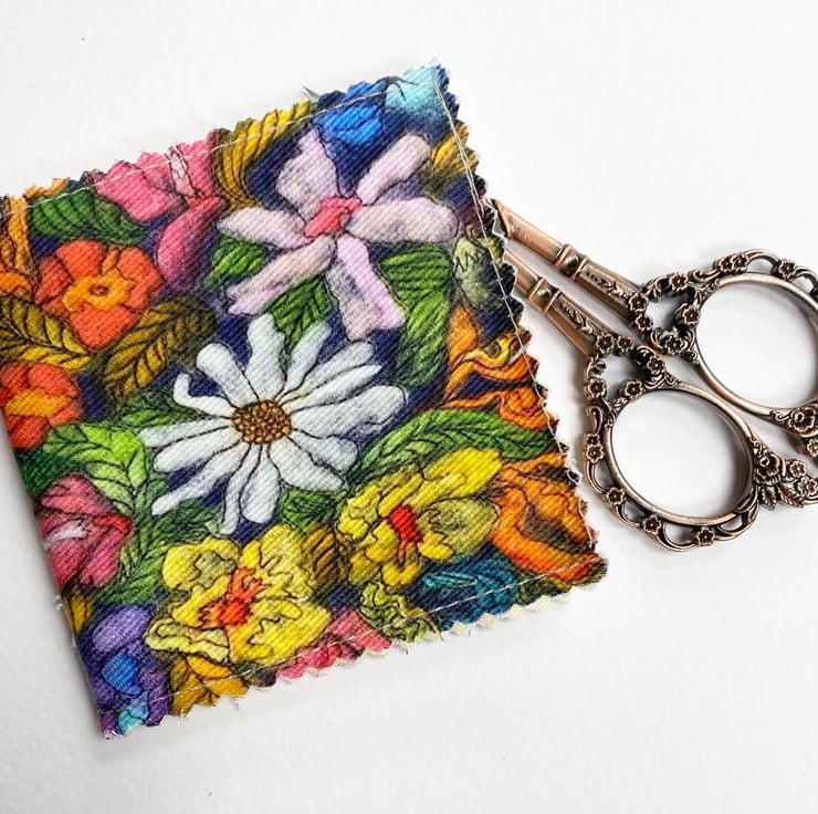 This charming needle and pins case shows a printed scene from one of my wet felted pieces. This one shows multiple garden flowers. It’s ideal for anyone who sews.