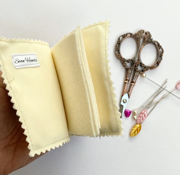 It opens like a book and contains 4 pages of felt. The cover measures 9 x 9cm approx. The pages are 8x8cm. The size of both does change depending on cuts.