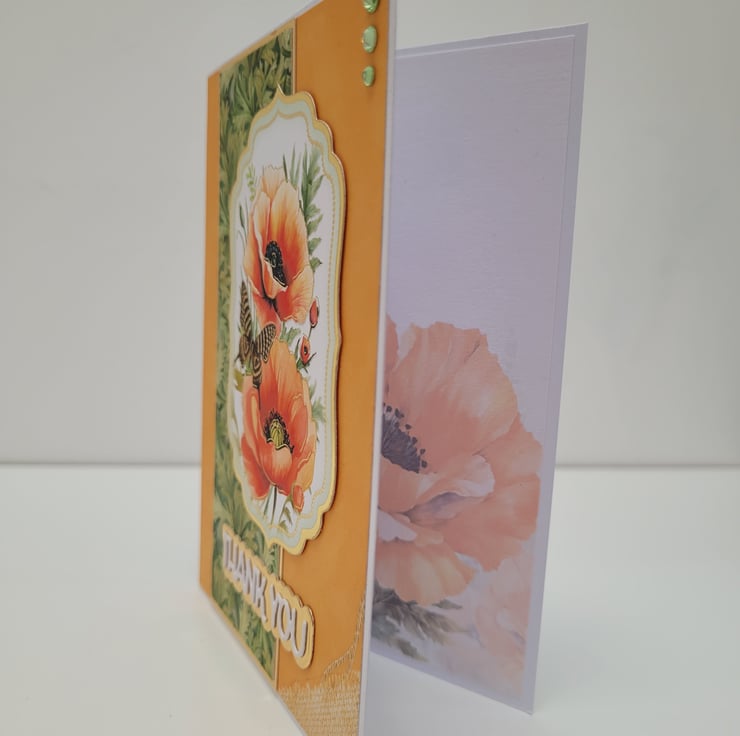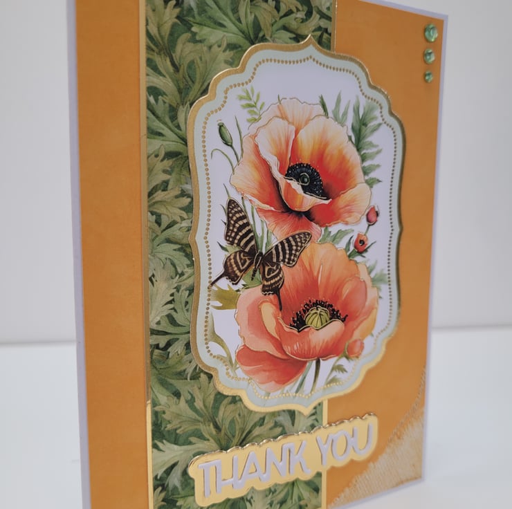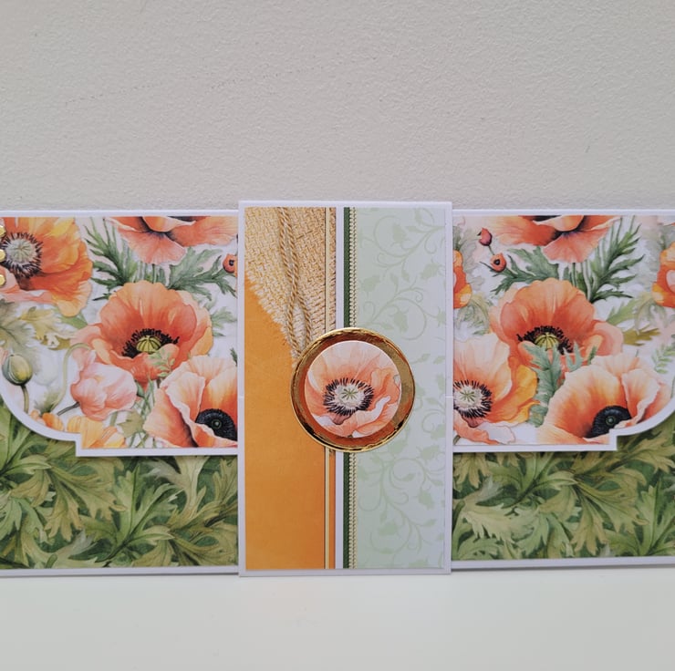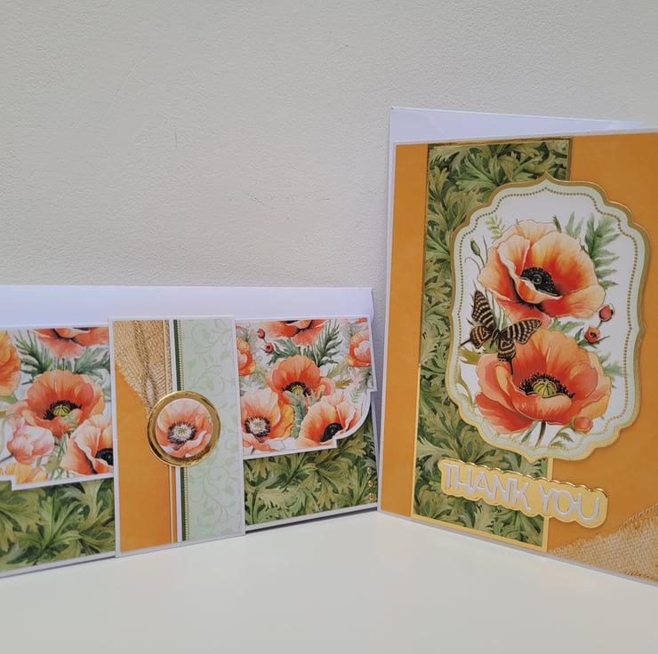 A handmade thank you card with matching money wallet / gift card holder, featuring poppies and coordinating patterned paper, accented with gold mirri card.