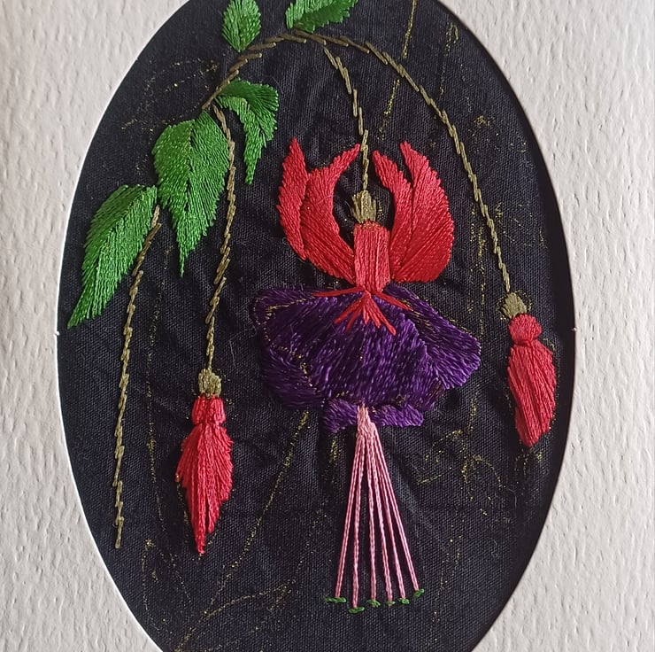 Fushia flower on black cotton material with silk thread and gold pen design.