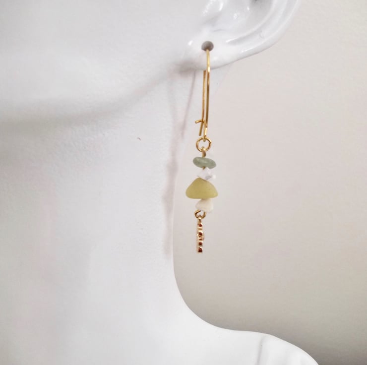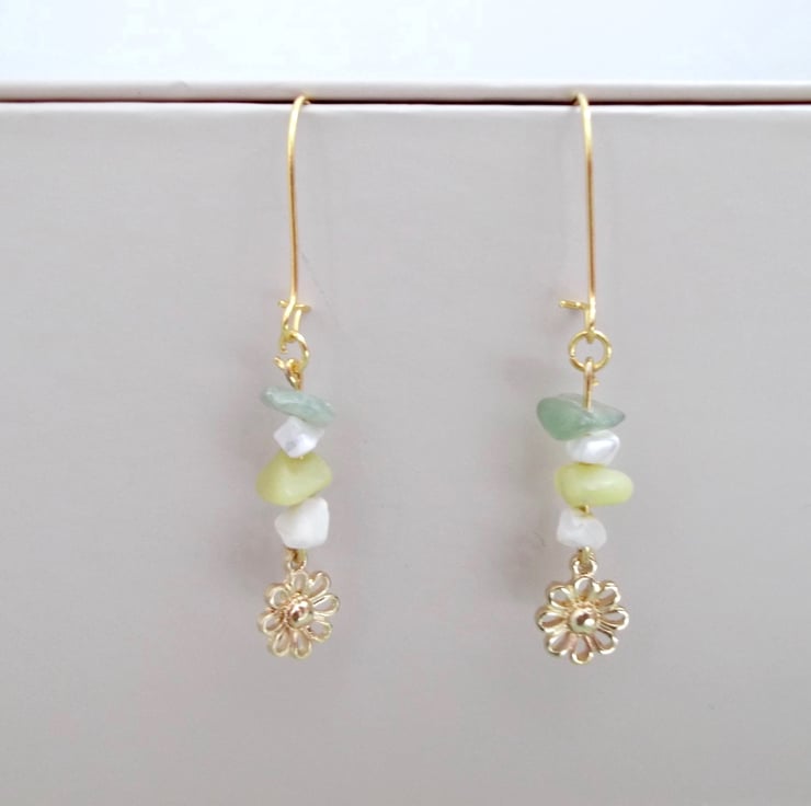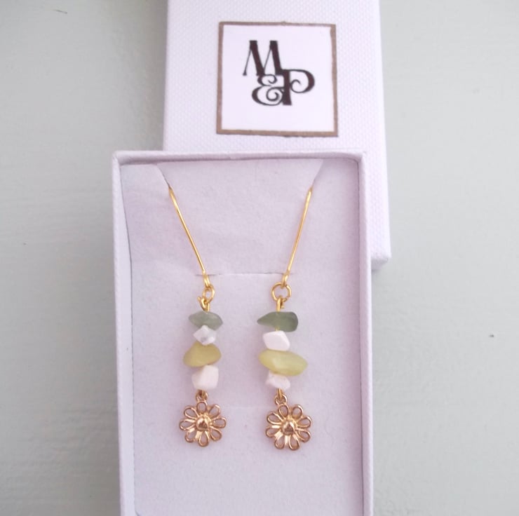 In my jewellery bits box I had a few of these gold plated daisy flowers which were perfect for dangle drop earrings. I picked out some healing crystal beads in summery green, white and yellow and put them together for this one of a kind pair of earrings.