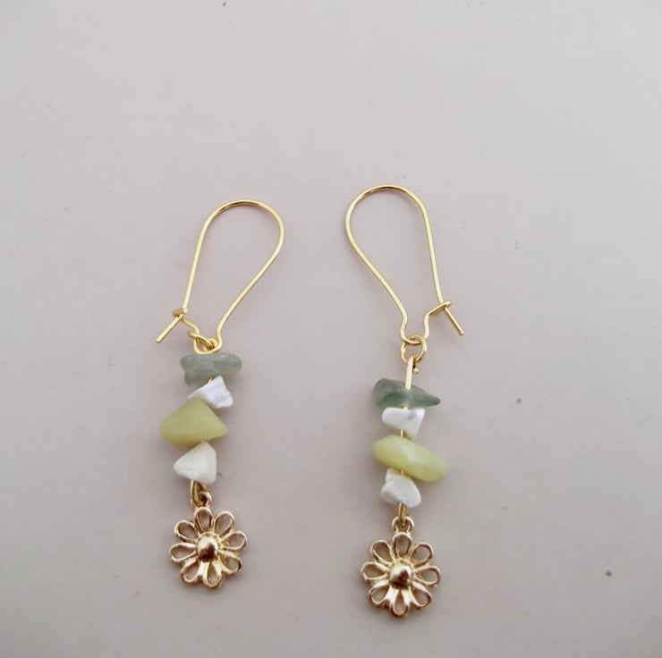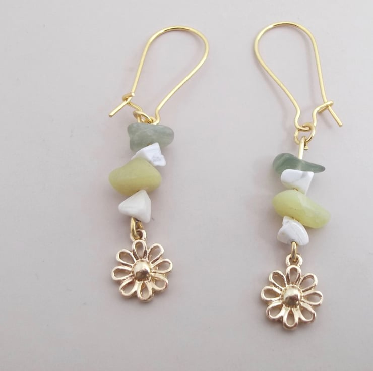 Stacked crystal stones dangling drop earrings with gold-plated daisy flower and jade crystal chip, howlite ( white jasper), yellow calcite and then another howlite ( white jasper) .