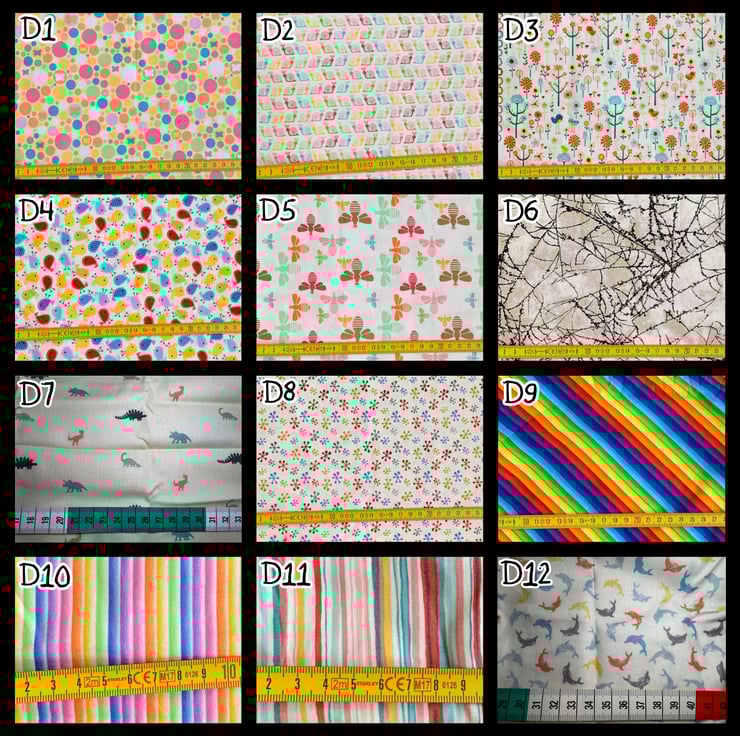 These are the white and rainbow colour fabrics I have available.
