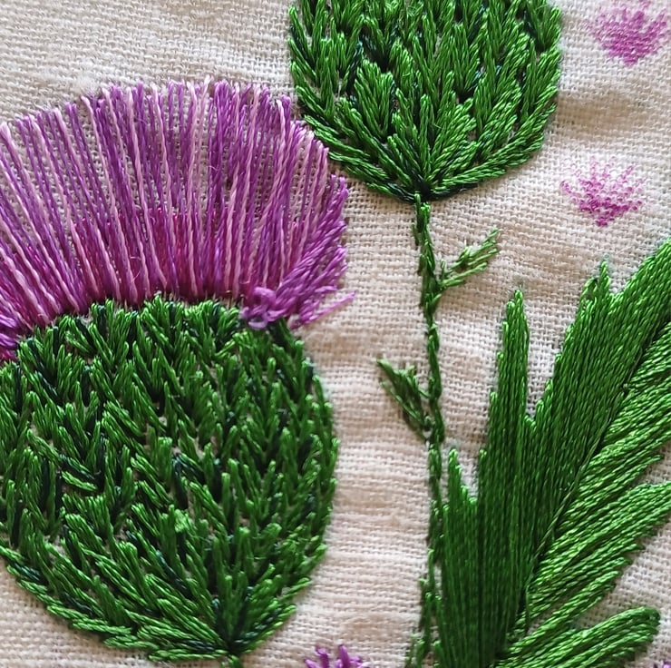 Handembroidered thistle with silk on cotton