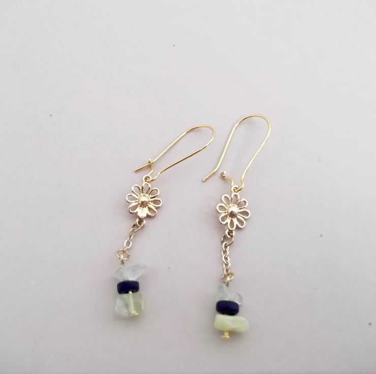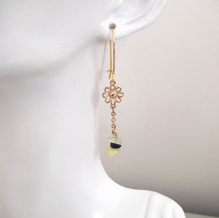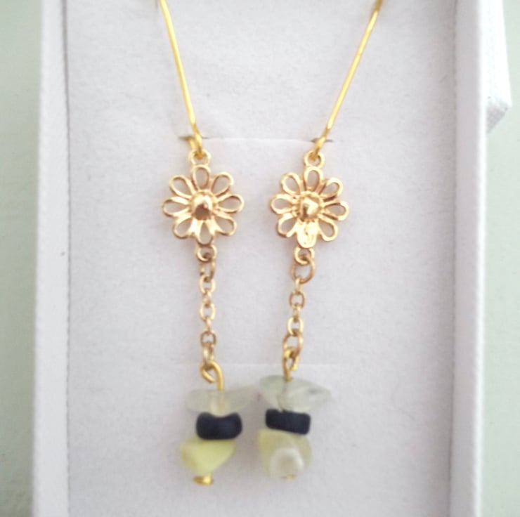 Daisy Flower Drop Earrings Jade, Yellow Quartz & Blue Wood Bead