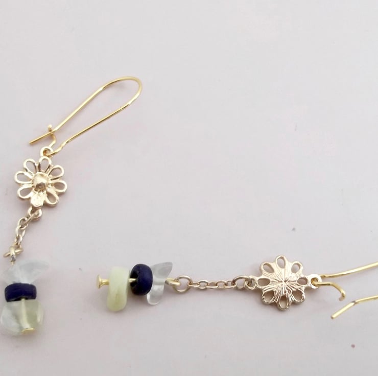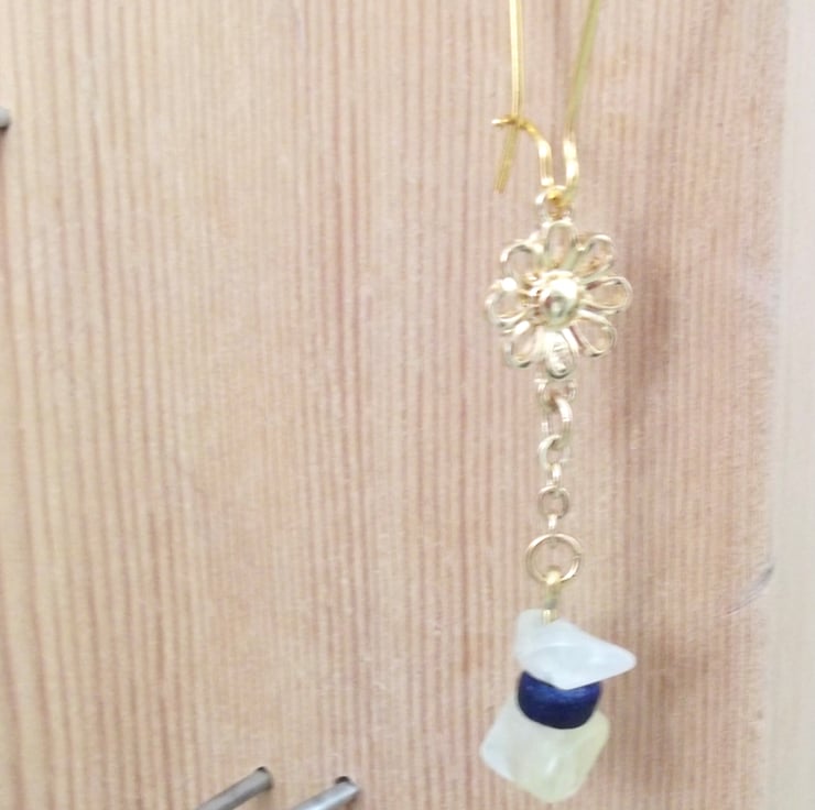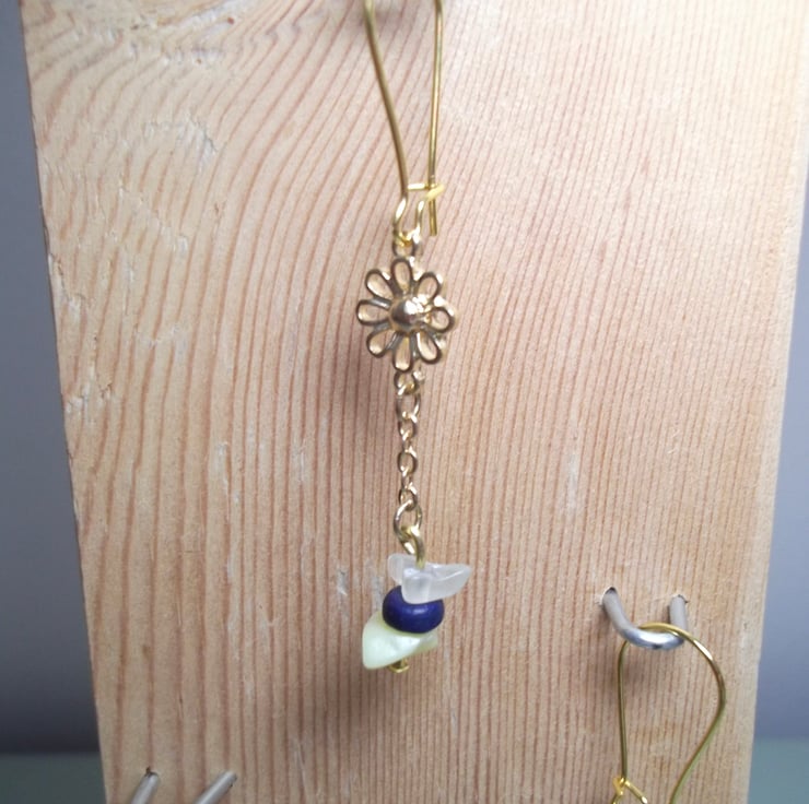 The final two daisy flower beads I have used to make this pair of earrings. I used some jade crystal beads with yellow quartz stones rather than yellow calcite and dark blue vintage wood beads for this one of a kind pair of earrings.