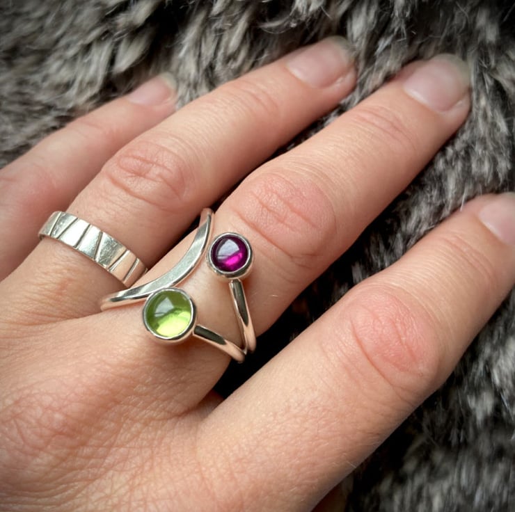 This handmade sterling silver ring features a flowing, formed and forged loop design, brought to life with two beautiful bezel-set gemstones. Its striking, contemporary style makes it perfect for any occasion; easy to wear, yet full of character and creativity.