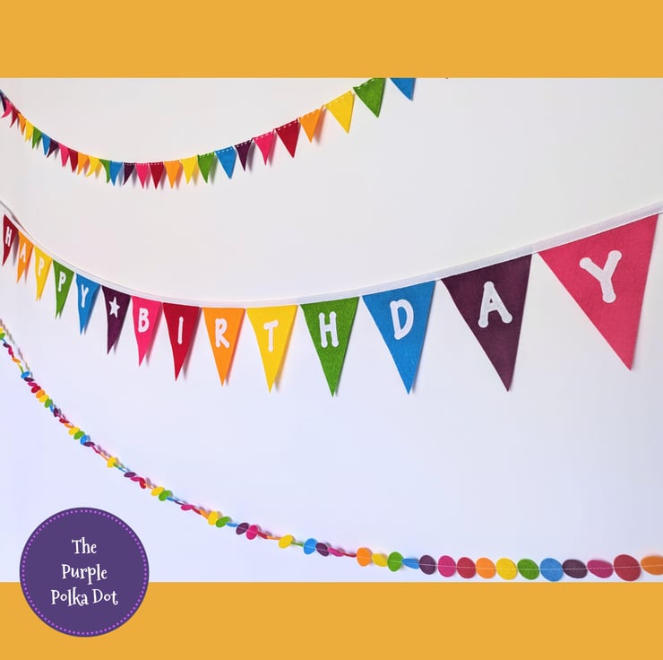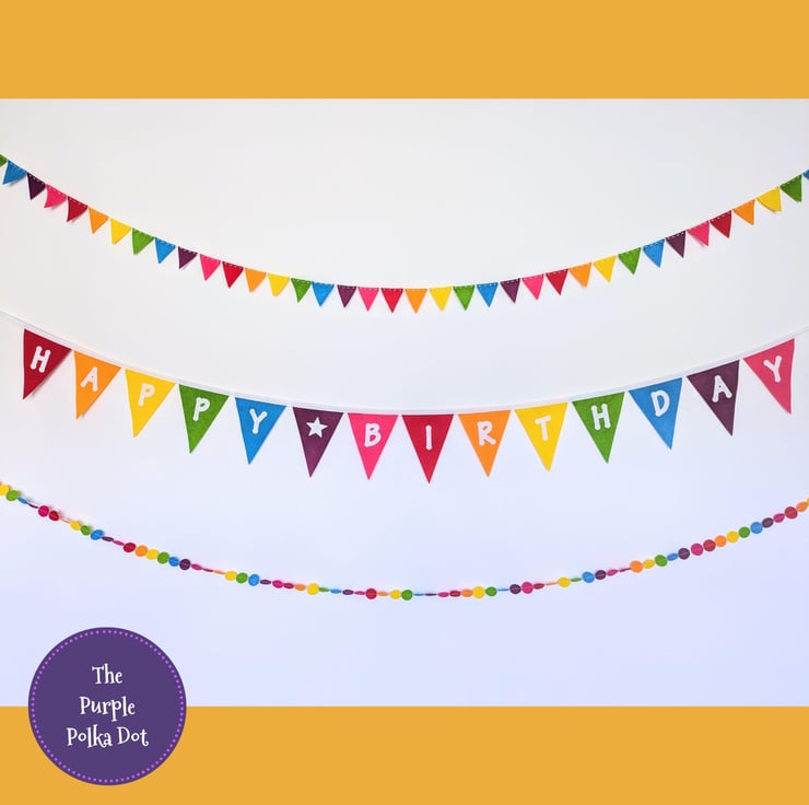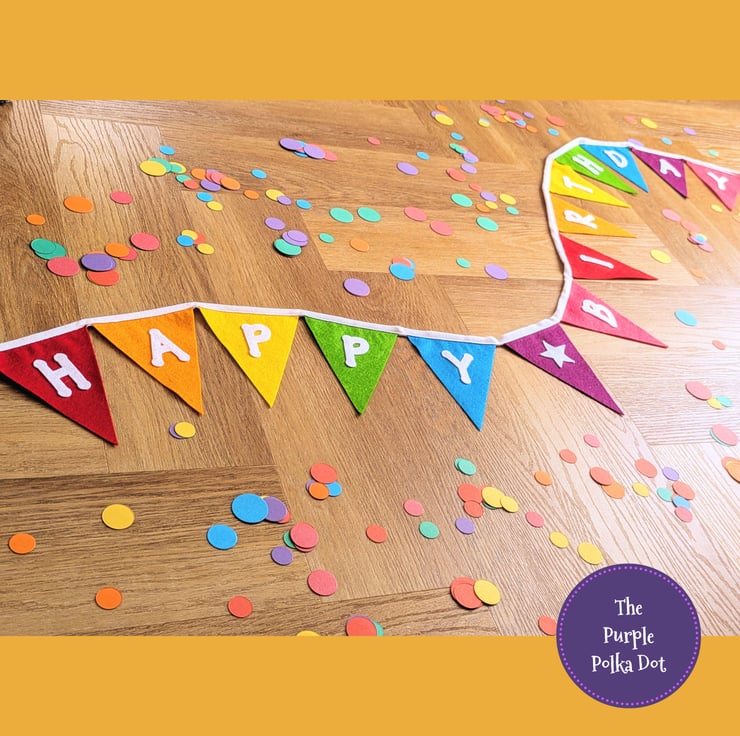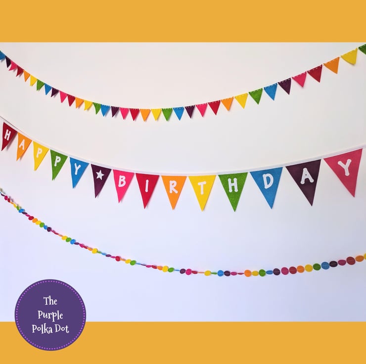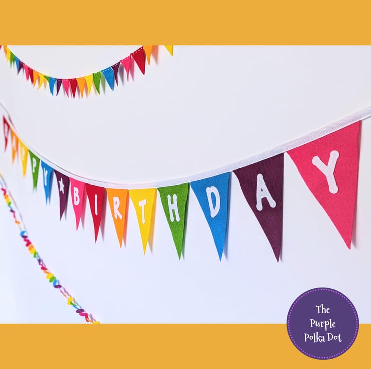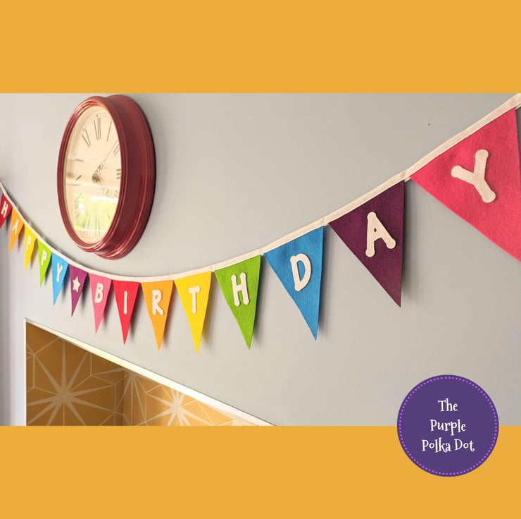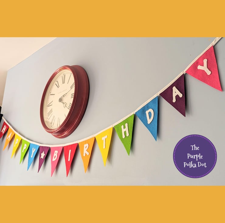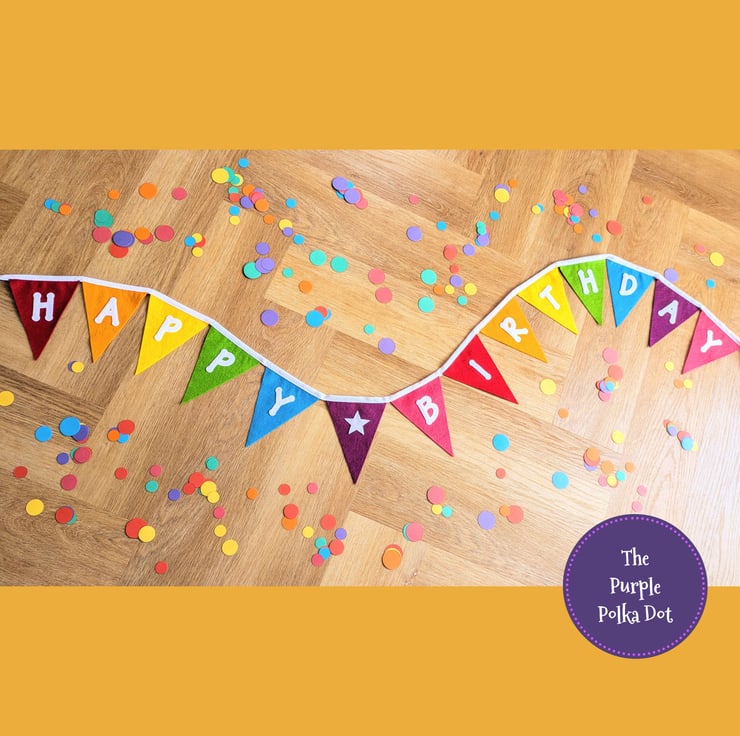 This fab happy birthday bunting will brighten up anybody's special day with its bright rainbow colours! Suitable for all ages and it can be used time and time again. The bunting is made from high quality sumptuously soft 40% wool blend felt in 7 bright colours (red, orange, yellow, green, blue, purple and pink) for the flags and contrasting white for the die-cut by hand lettering.