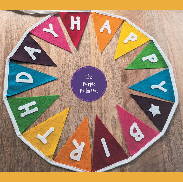 I'm all about the bright happy rainbow colours! I also like to give my customers options. This is one of many rainbow birthday banner options available here at The Purple Polka Dot. I never tire of making them! They are endlessly fun and cheerful and I love posting them out to customers knowing they will be used to mark significant milestones for them or their loved ones.