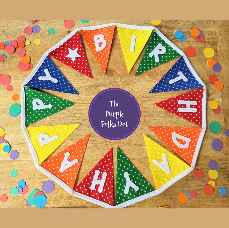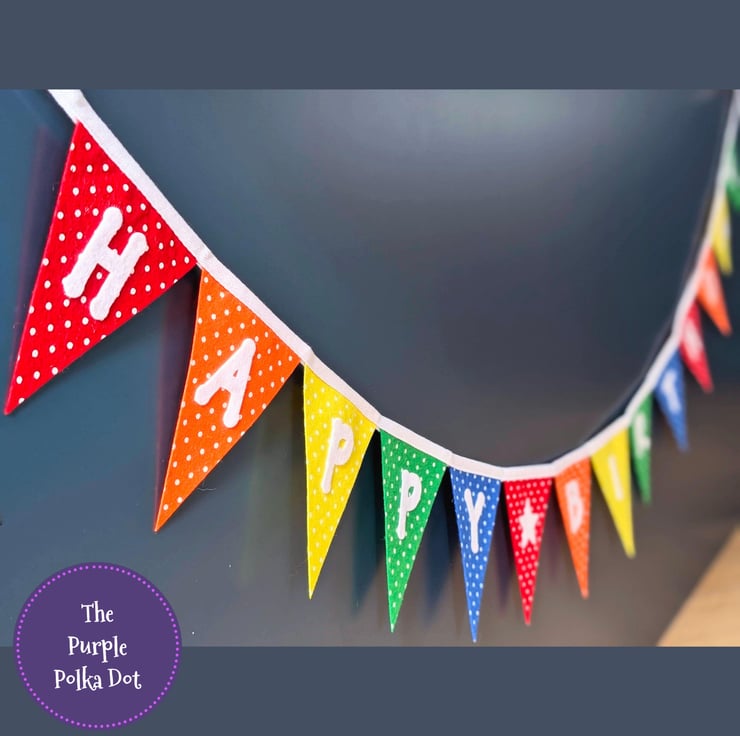 The bunting is made from premium acrylic polka dot felt in 5 bright colours (red, orange, yellow, green, and blue) for the flags and contrasting white wool blend felt for the lettering. Each flag is machine sewn on to quality cotton tape for durability.