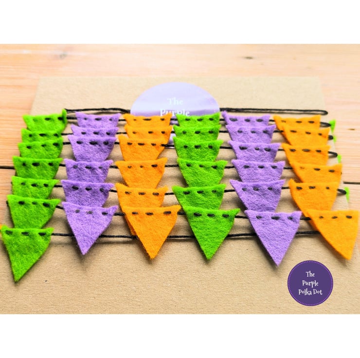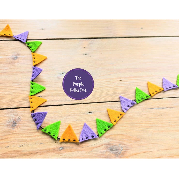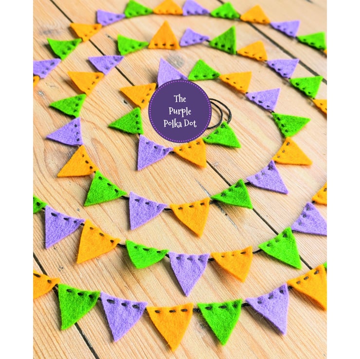 Each mini felt flag measures approximately 1 inch/2.5cm and each is individually hand cut and hand sewn onto black cotton thread. The felt used is sumptuously soft premium quality 40% wool blend felt in orange, purple and green. There is an excess of 15cm of black embriodery thread on either side for hanging. The flags can slide along the thread so it is possible to space them further apart or more bunched up should you wish to, and you can cut the garland into smaller lengths to decorate different areas or items (round a table, to decorate a cake stand, to make some cake topper bunting etc) if that is your intended use.