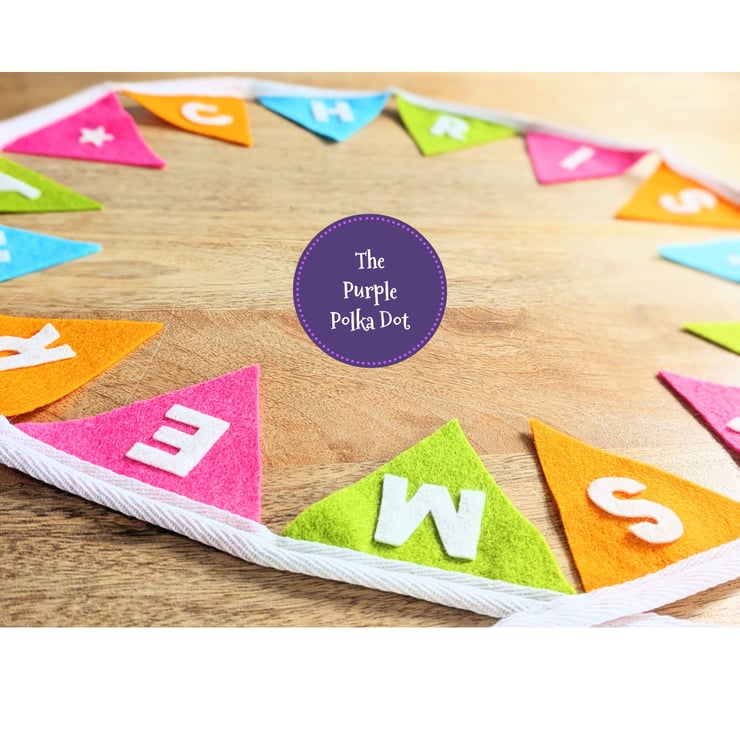 Each strand of bunting is lovingly handcrafted from sumptuously soft 40 % wool blend felt in leaf green, candy pink, orange and ice blue for the flags and off-white for the lettering. Each flag measures approximately 10cm x 10cm and each is machine sewn onto quality cotton herringbone tape in white. The bunting flags collectively measure approximately 150cm in length with an extra 50cm of bunting tape at either end for hanging or tying. The bunting in its entirety therefore measures approximately 250cm.