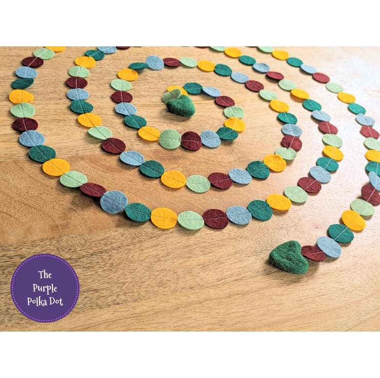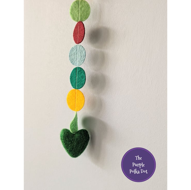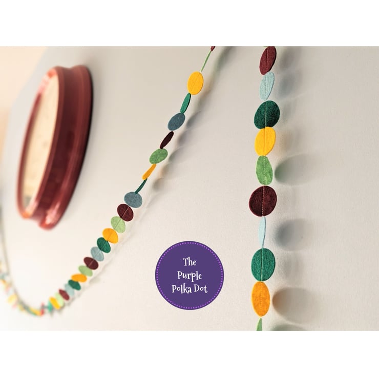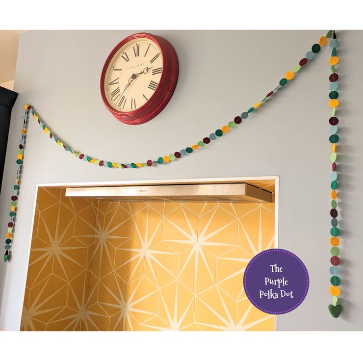 This Polka Dot felt circle garland makes for a perfect decoration for the home or a unique gift. Available in a variety of different lengths to suit your needs, each garland is comprised of 1 inch wool blend (40%) felt circles which have been die-cut by hand in mint green, mustard yellow, holly green, sky blue and burgundy, and then machine sewn together for durability. You have the option of wool felt hearts for the ends (available in a range of colours - please get in touch if you would like a different colour to the green), or alternatively you can opt for thread hanging loops or neither of these if you would simply like a string of circles with nothing at either end. If I don't hear anything from you I will assume you would like the green hearts as pictured and will make up your order as per the photos.