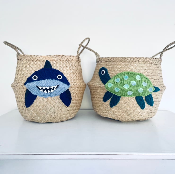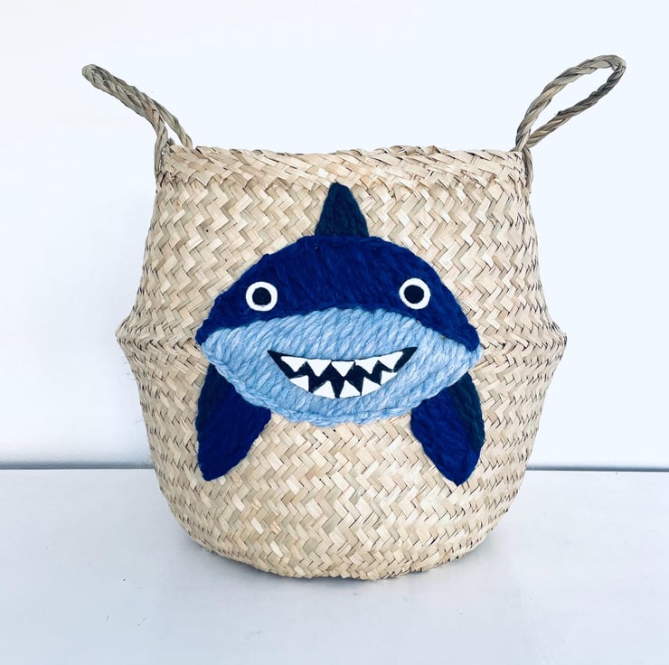 A super cute shark belly basket, hand embroidered using the softest felt and wool - it will make an adorable addition to a nursery, playroom or bedroom.