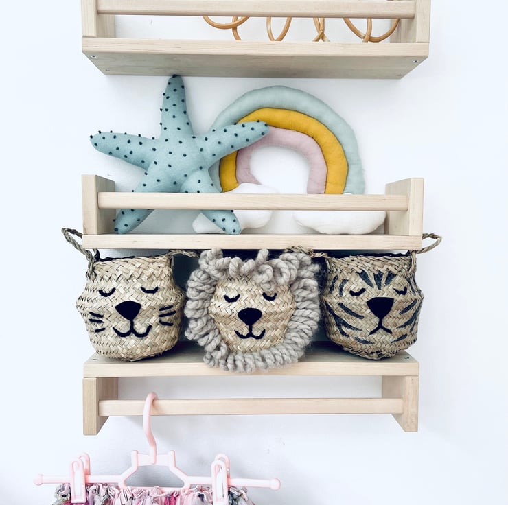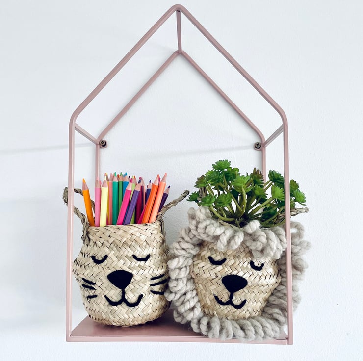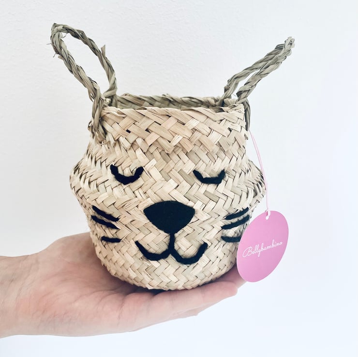 A cute little cat belly basket, great for a jungle safari themed bedroom or nursery. His teeny size is ideal for storing pencils, trinkets, hair bands and all those special tiny things neat and tidy on your shelf.