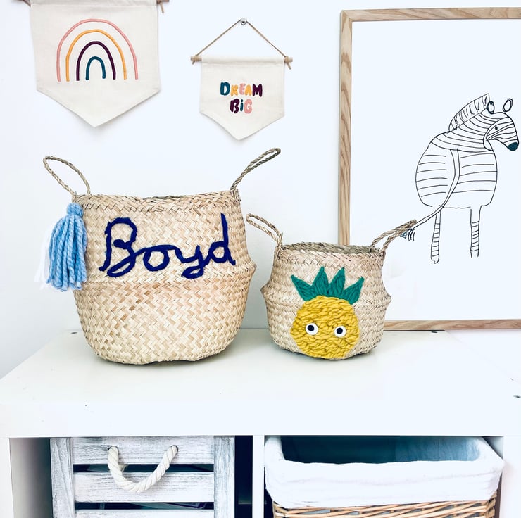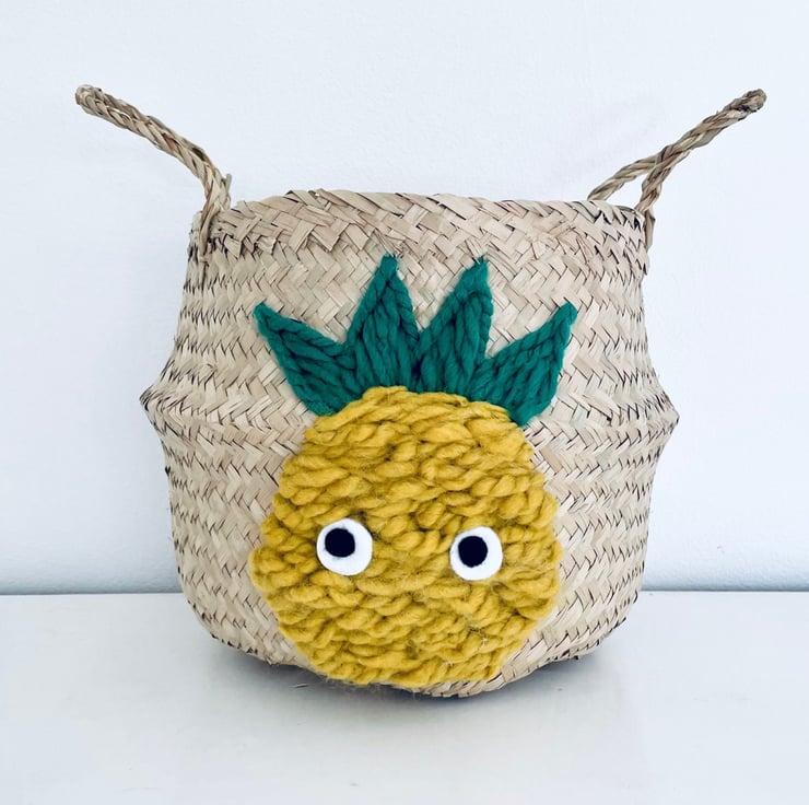 A beautiful Bellybambino Basket. This hand embroidered seagrass belly basket has lovely hand stitched pineapple. A lovely storage basket perfect for storing little bits and bobs, or even as a little cute plant pot! The naturally grown seagrass used to make this basket is sustainable, renewable and friendly to the environment.