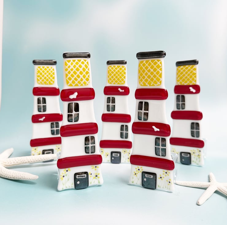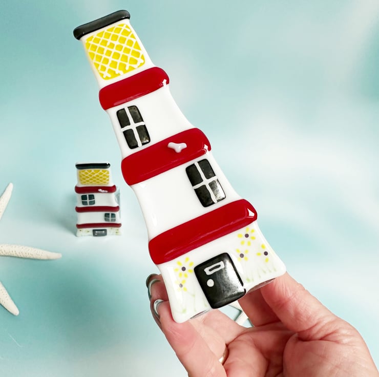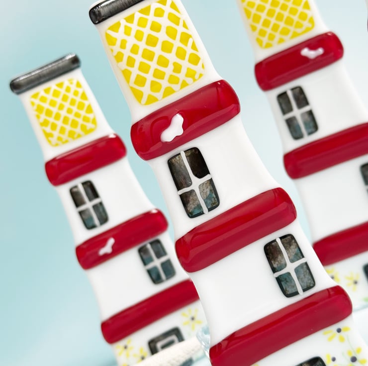 Hand cut white base glass with the addition of stripes and details in red, yellow and black.